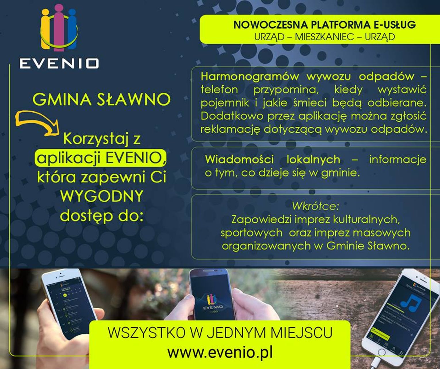 Gmina Sławno, jako kolejna w kraju uruchomiła nowoczesną platformę e-usług Evenio. Jest to zintegrowany system informacyjny, wspierający gospodarkę odpadami. Korzystanie z mobilnej aplikacji daje użytkownikowi dostęp do harmonogramów wywozu odpadów w wybranej przez niego lokalizacji.