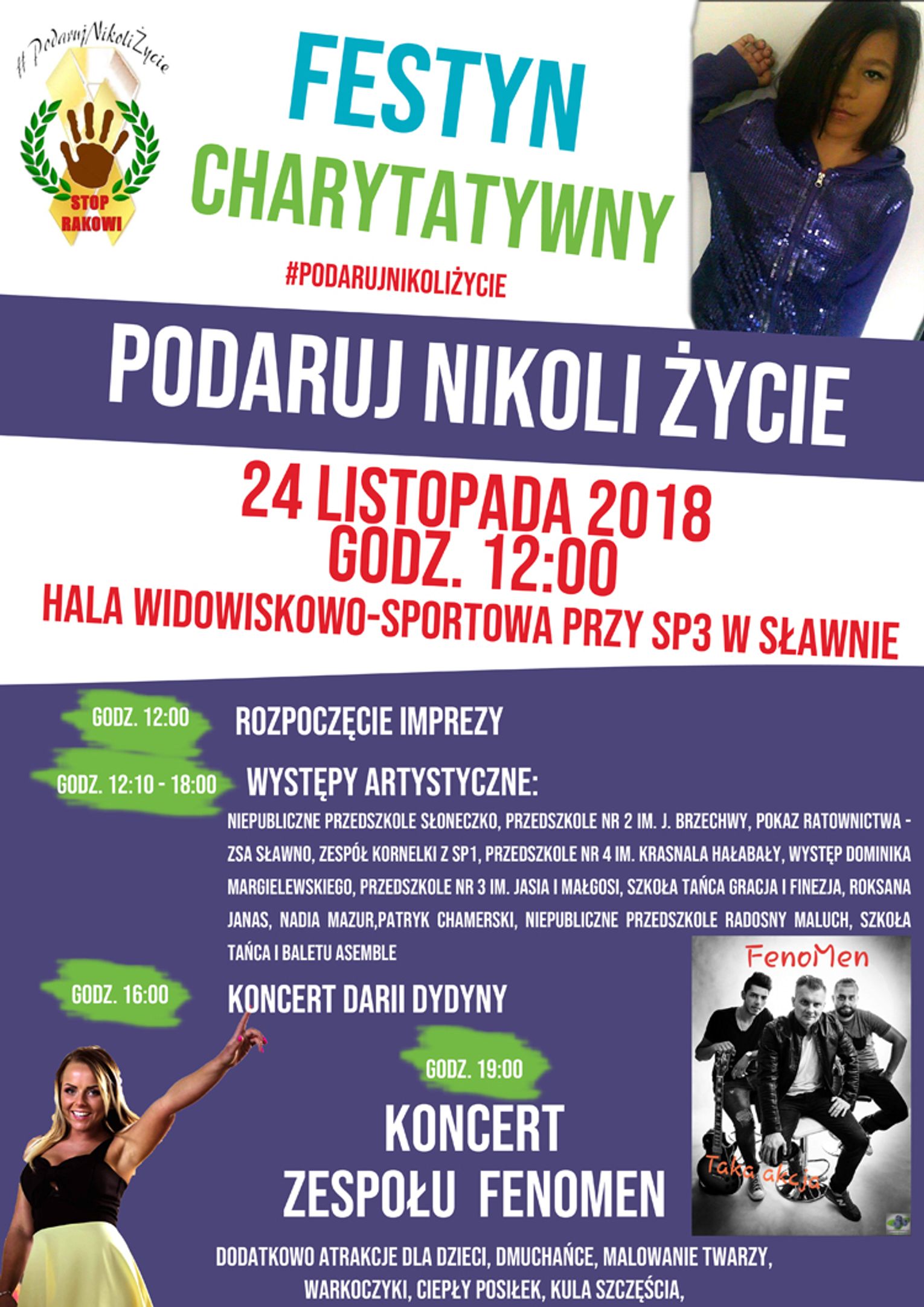 Już w najbliższą sobotę (24.11), w Hali Sportowej OSiR przy Szkole Podstawowej nr 3 w Sławnie zorganizowany zostanie Koncert Charytatywny na rzecz ciężko chorej Nikoli Janas.