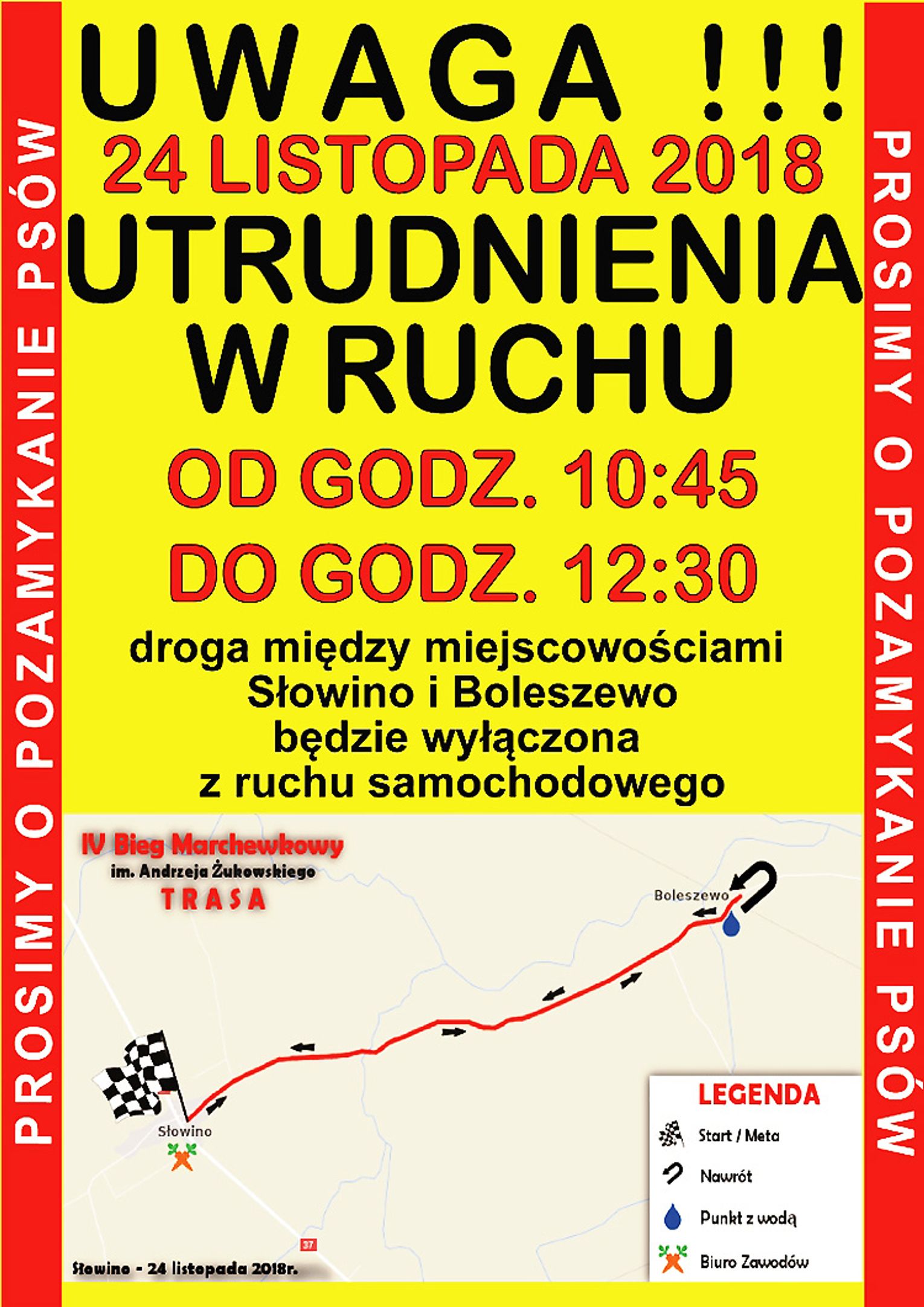 Urząd Gminy Darłowo - organizator IV Biegu Marchewkowego im. Andrzeja Żukowskiego informuje o utrudnieniach w ruchu kołowym na drodze powiatowej między Boleszewem i Słowinem w dniu 24 listopada 2018 r. (sobota) od godz. 10:45 do godz. 12:30.