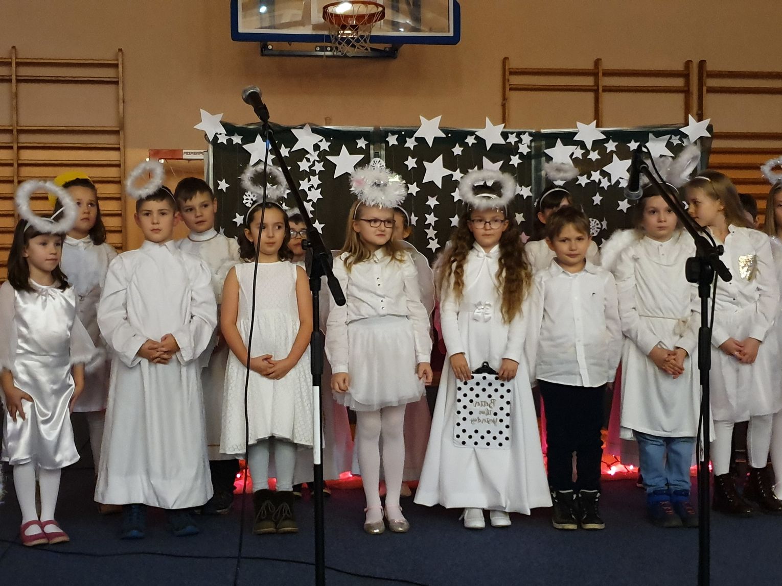 W koncercie wystąpili uczniowie szkoły, zarówno ci młodsi z klasy drugiej, jak i trochę starsi z klas piątych, szóstych, siódmych i ósmych. Dodatkową atrakcją był występ zespołu „ 13 i Przyjaciele”. Na scenie z uczniami występowali także, przygotowujący ich do występu nauczyciele. Było radośnie, zabawnie, świątecznie, a momentami wzruszająco i podniośle. Na występ, oprócz dyrekcji szkoły i nauczycieli, licznie przybyli rodzice i rodziny wykonawców. Na zakończenie koncertu wszyscy uczestnicy wspólnie zaśpiewali „ Świeć gwiazdeczko”. Dziękujemy wszystkim wykonawcom i nauczycielom za zaangażowanie i piękny występ. Organizatorzy SU