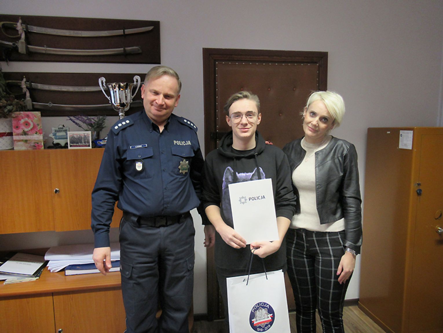 Za tak wspaniałą postawę nadkomisarz. Andrzej Kamoda - Komendant Powiatowy Policji w Sławnie osobiście podziękował 15 – latkowi. Jednocześnie wyraził uznanie za jego właściwą reakcję. Chłopakowi towarzyszyła jego mama.