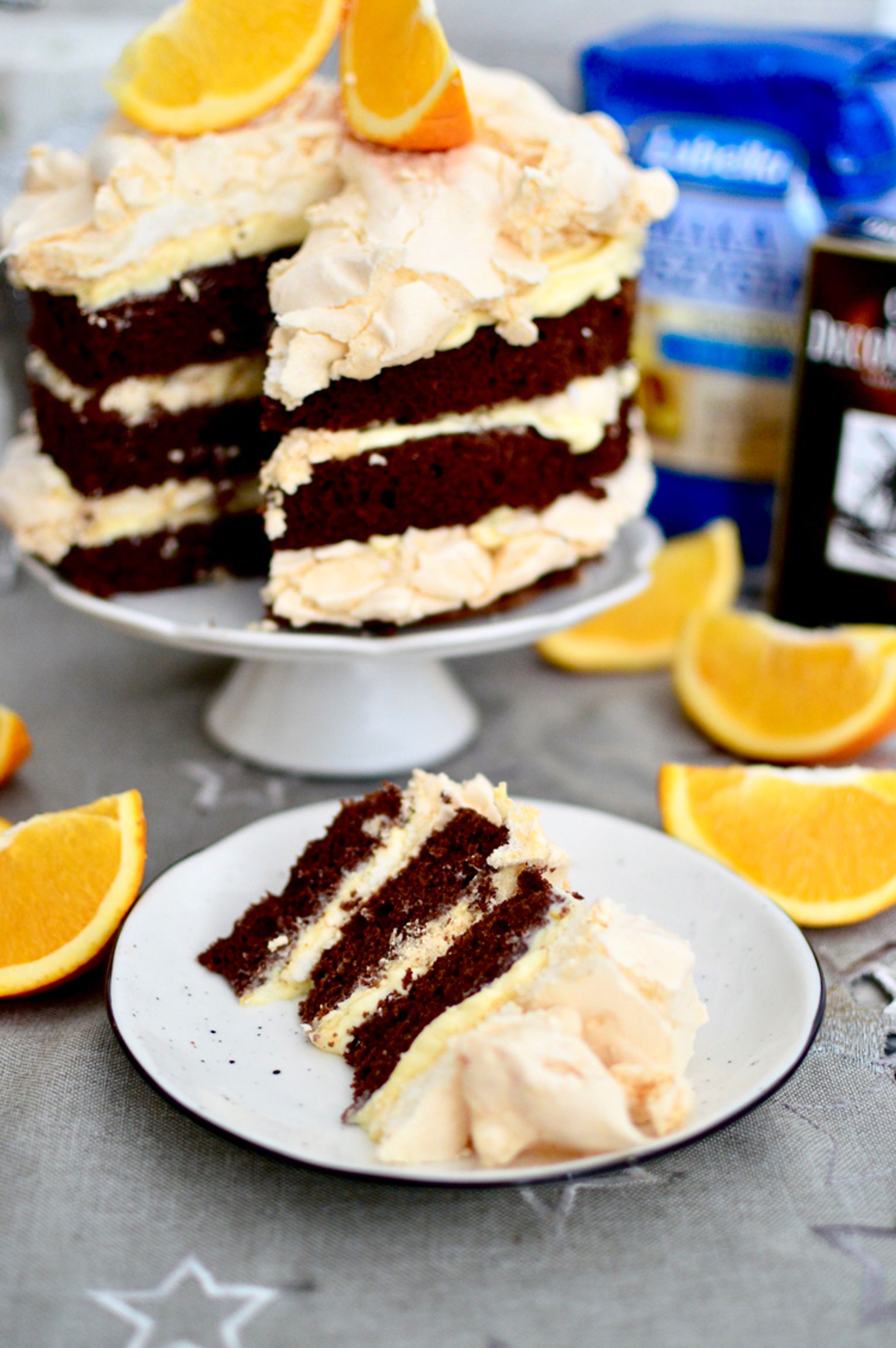 4. Gotowy i ostudzony biszkopt przekrój na 3 blaty. Każdy z nich nasącz sokiem pomarańczowym wymieszanym z likierem. Ułóż pierwszy blat na talerzu, jego wierzch posmaruj kremem. Połóż upieczoną bezę i posmaruj jej wierzch łyżką kremu. Połóż kolejny blat biszkoptu delikatnie dociskając do poprzedniej warstwy i postąp z nim tak samo jak z poprzednim. Następnie ułóż ostatni blat biszkoptu, jego wierzch posmaruj kremem i ułóż na nim najładniejszą ze wszystkich bez. Tort nadaje się od razu do podania natomiast można go schłodzić w lodówce – będzie jeszcze smaczniejszy.