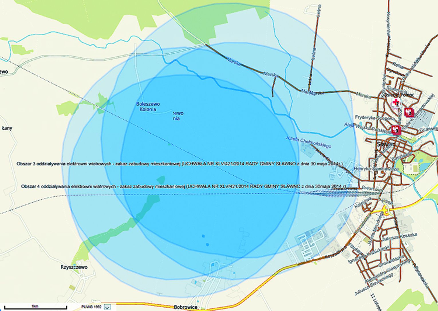 Obowiązuje, bo w 2014 r. gminny samorząd, zmienił plan zagospodarowania przestrzennego i pozwolił na postawienie 4 wiatraków w okolicach Boleszewa, Rzyszczewa i Bobrowic. W maju 2016 r. PiS przeforsował nowe przepisy powodujące, że w promieniu około 1800 m od każdego z planowanych wiatraków nie można wybudować żadnego nowego domu. Także na terenie Sławna.