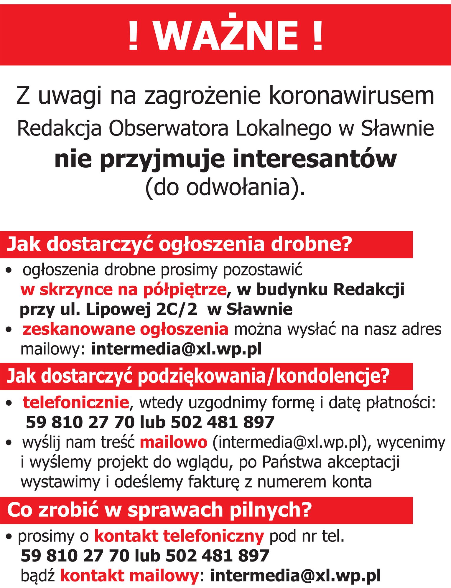 Z uwagi na ryzyko zarażenia koronawirusem Redakcja Obserwatora Lokalnego w Sławnie, do odwołania, nie przyjmuje interesantów. Wszelkie sprawy pilne prosimy konsultować telefonicznie lub mailowo.
