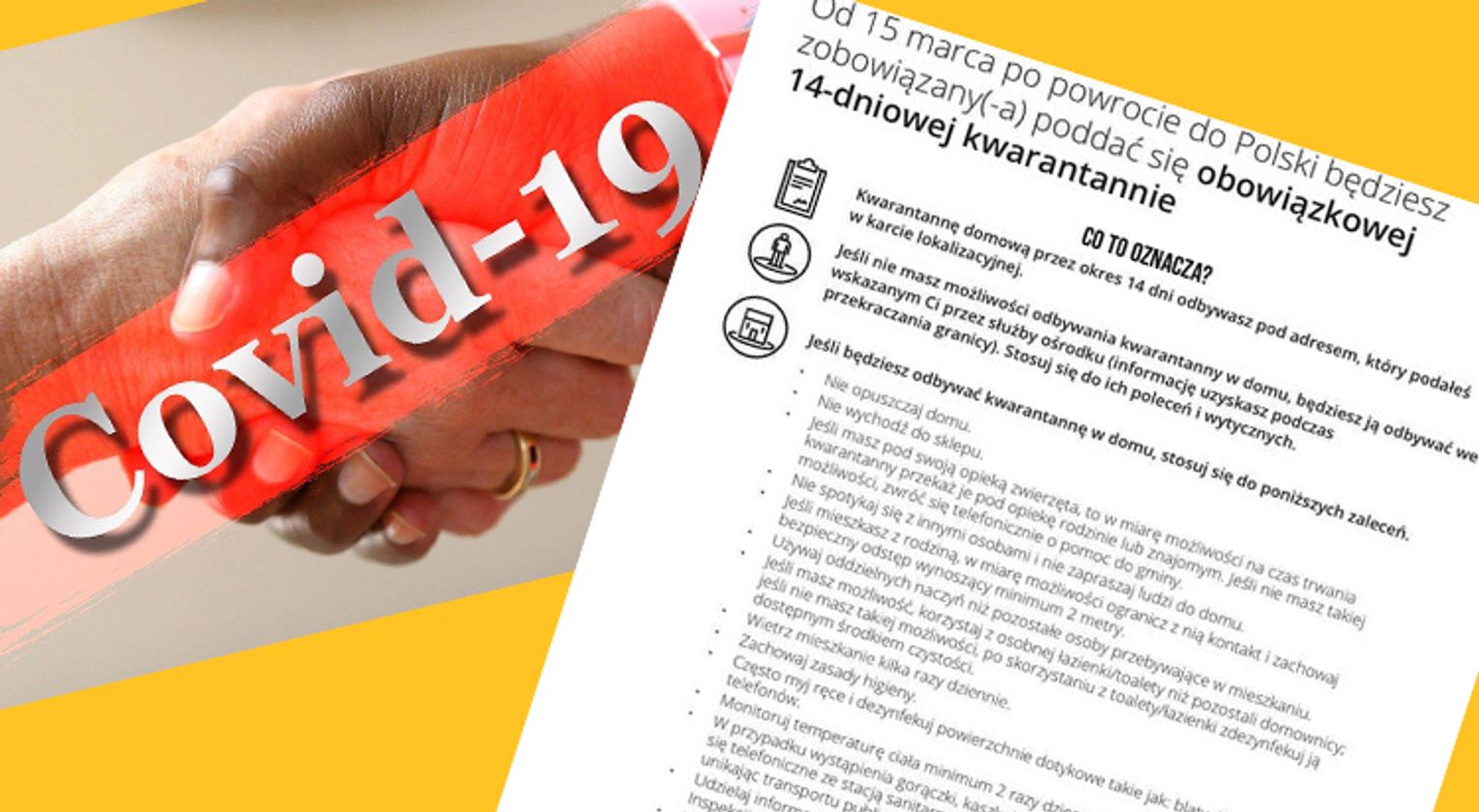 Od niedzieli 15 marca Polska zamyka na 10 dni granice naszego kraju dla cudzoziemców. Wszyscy polscy obywatele znajdujący się teraz poza granicami – mogą wracać do Polski. Będą także poddani obowiązkowej 14-dniowej kwarantannie domowej.