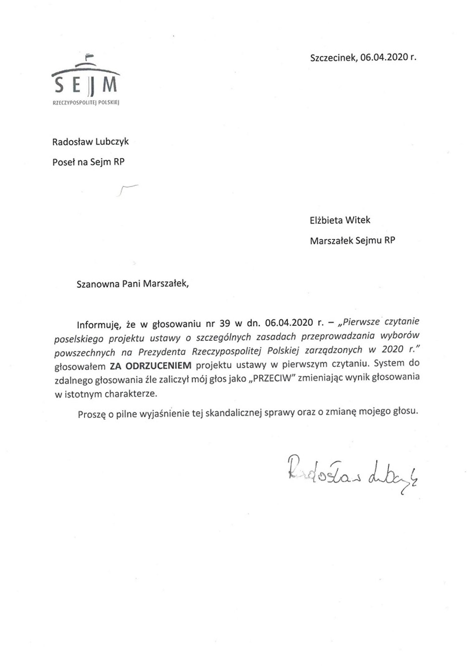 Już po głosowaniu tłumaczył, że jest przeciwny projektowi głosowania korespondencyjnego i w ten sposób głosował, jednak system pokazał coś innego.