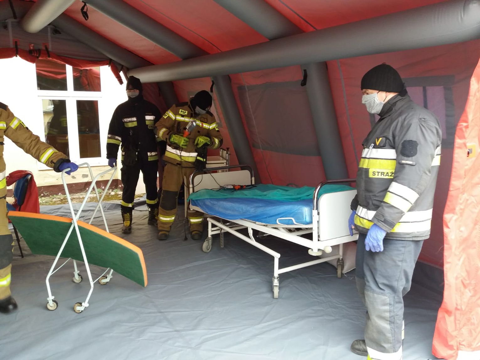 - strażacy z Jednostki Ratowniczo-Gaśniczej w Sławnie na bieżąco monitorują namiot pneumatyczny pełniący funkcję polowej izby przyjęć, który rozstawiony jest przy Szpitalu Powiatowym w Sławnie.