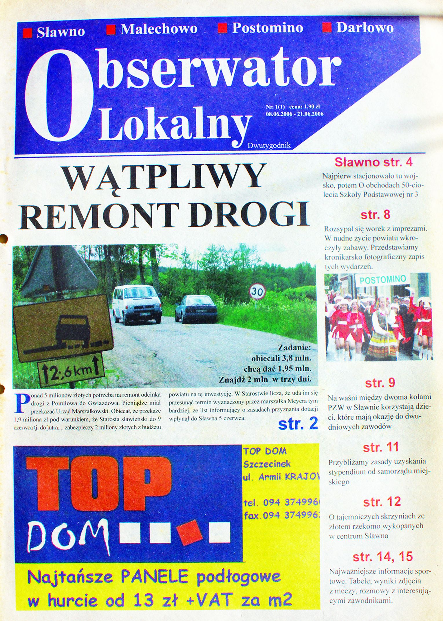 Okładka pierwszego numeru Obserwatora Lokalnego. Gazeta ukazała się 8 czerwca 2006 r. Początkowo, do października 2006 r. była dwutygodnikiem. Następnie przekształciliśmy ją w tygodnik, aby jeszcze lepiej i szybciej informować Czytelników o wiadomościach Ziemi Sławieńskiej oraz okolic.