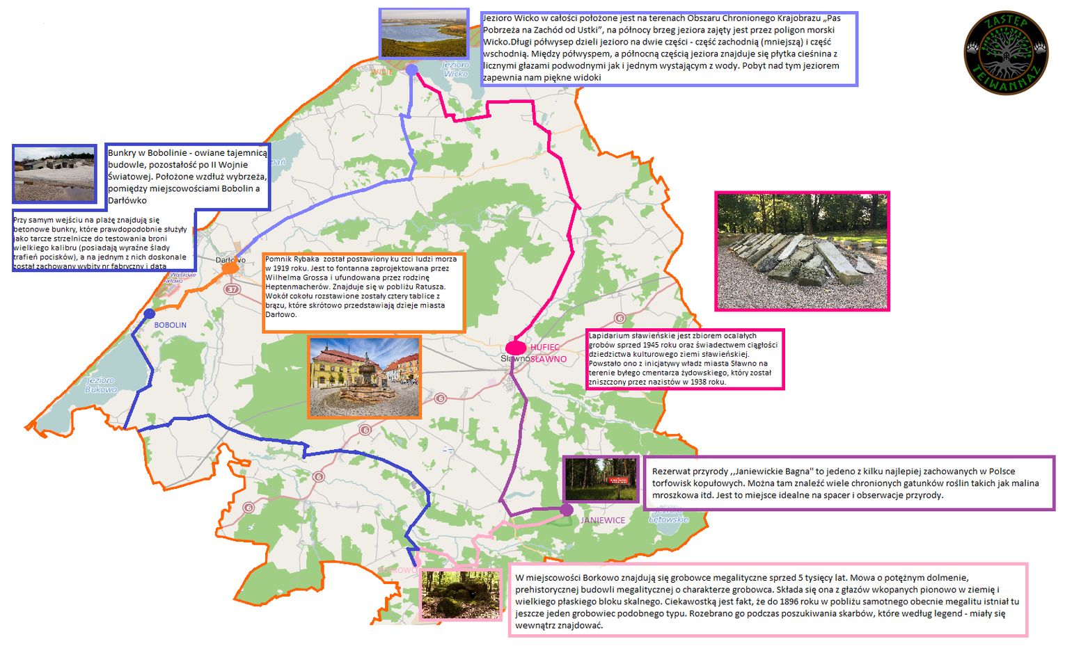 Zadaniem zastępów było wytyczenie trasy, która obejmowała wszystkie miejskie i wiejskie gminy naszego Powiatu oraz zaproponowanie miejsc, obiektów i zabytków, które w opinii uczestników zabawy - zasługują na szczególną uwagę. Na liście powiatowych atrakcji turystycznych znalazły się między innymi: Zamek Książąt Pomorskich i Pomnik Rybaka w Darłowie, kościoły w Sławnie, Malechowie, Łącku i Żukowie, bramy miejskie w Sławnie, latarnia w Jarosławcu, lapidarium w Sławnie, bunkry w Bobolinie, pałac w Ostrowcu, siedziba dawnych właścicieli Kwasowa, dawna Willa Schultza, jeziora w Wicku, Ostrowcu i Marszewie, rezerwaty „Janiewickie Bagna” i „Sławieńskie Dęby”, megality w Borkowie, okolice Barzowic, Fort Marian w Malechowie, i wiele innych. Łącznie nasi harcerscy przewodnicy wskazali aż 41 miejsc godnych odwiedzenia. W realizacji zadania wzięło udział pięć zastępów z 12. Leśnej Wielopoziomowej Drużyny Harcerskiej „Drzewianie” i 6. Wielopoziomowej Drużyny Harcerskiej „Dzieci Neptuna” ze Sławna. hm. Jacek Błaszczyk