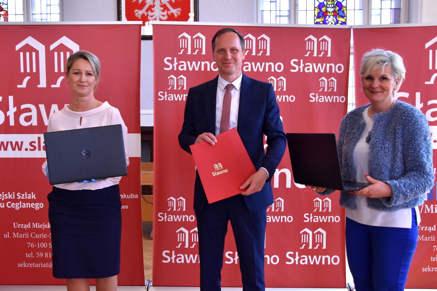 W dniu 06 maja 2020 roku Krzysztof Frankenstein - burmistrz Sławna przekazał komputery na ręce sławieńskich dyrektorek. Symboliczne laptopy odebrały: Dagmara Wojtczak - Dyrektor Szkoły Podstawowej nr 3 w Sławnie oraz Ilona Bocheńska-Michalik - p.o. Dyrektora Szkoły Podstawowej nr 1 w Sławnie.