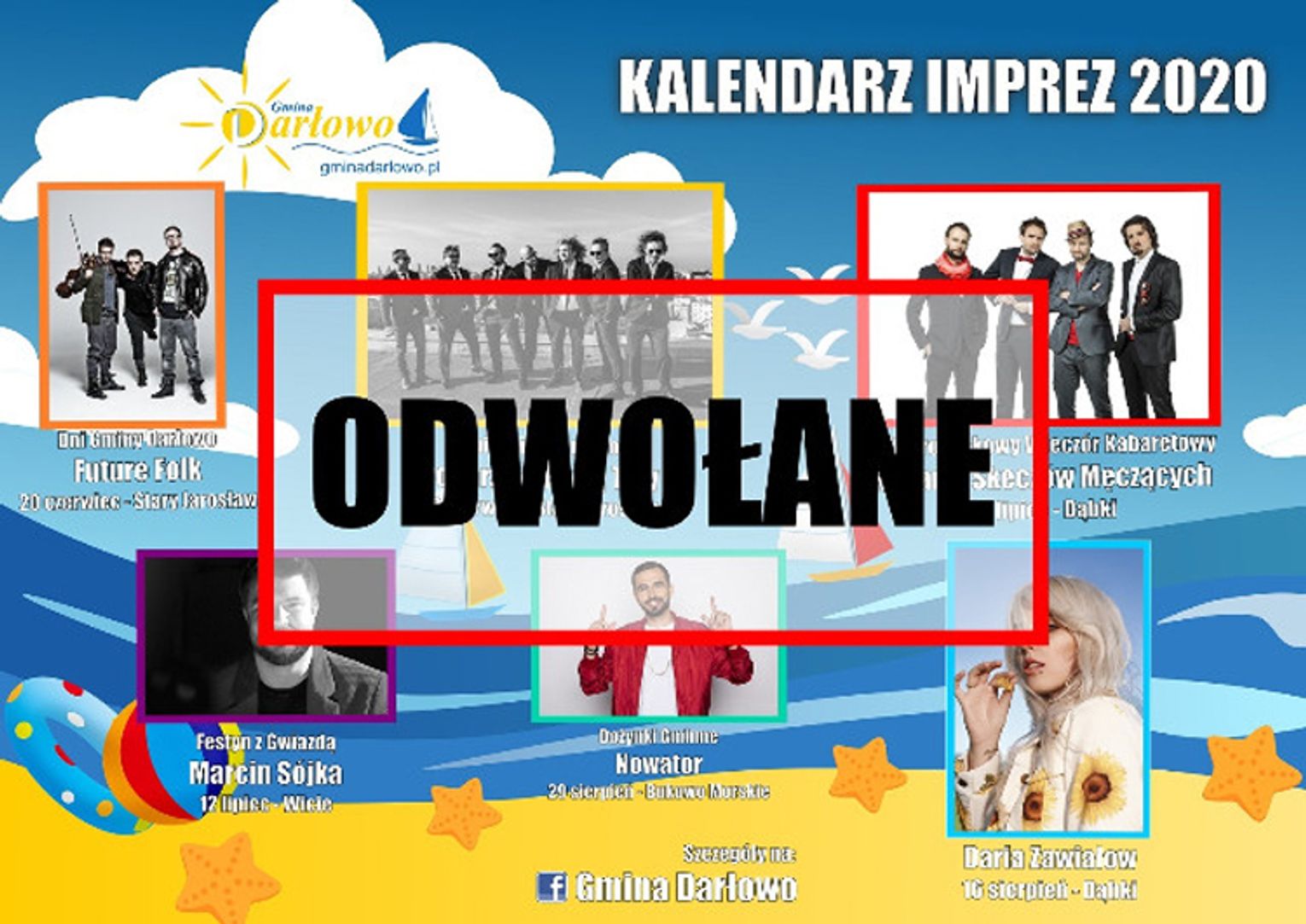 Po ocenie obecnej sytuacji w Polsce i na świecie, po długich rozmowach, Gmina Darłowo postanowił odwołać imprezy koncertowe w sezonie letnim. Nie odbędą się takie wydarzenia, jak: