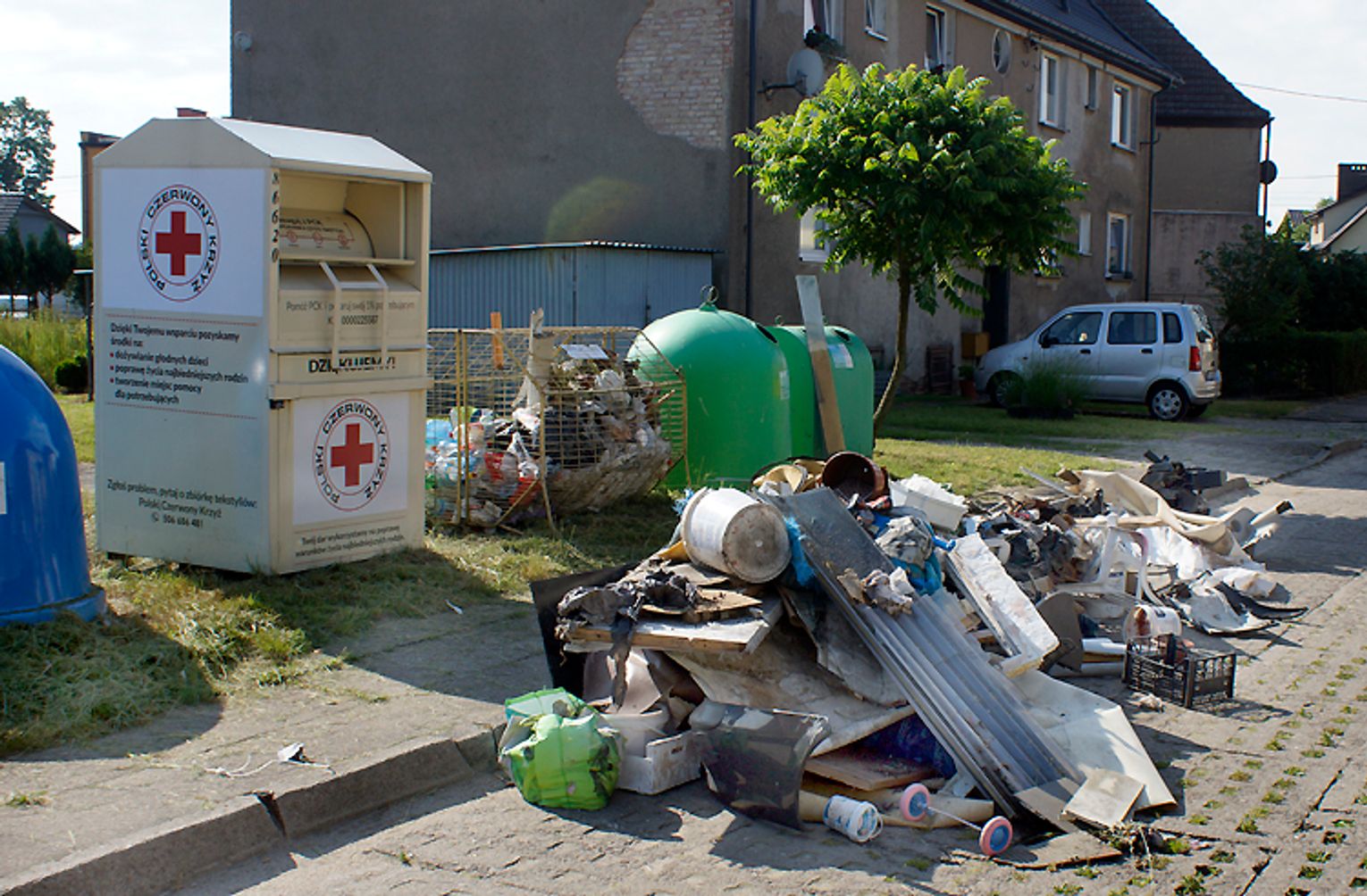 Pomiędzy blokami na Żeromskiego, na trawniku, przy chodniku, stoją pojemniki na odpady. Ich otoczenie od dawna przypomina dzikie wysypisko śmieci, bo jest miejscem, gdzie znoszone (zwożone) są śmieci z całego ODW (i nie tylko).