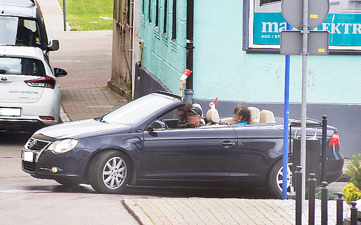 Przez blisko dwie godziny widoczny na zdjęciu samochód wraz z „zawartością” w postaci dwóch młodych kobiet oraz około 40-letniego faceta z Warszkowa jeździł po Sławnie i co chwila trąbił. Panie wymachiwały biało-czerwonymi chorągiewkami. Pojazd uwagę zwracał nie tylko trąbieniem, ale także głośno puszczoną discopolową piosenką o Andrzeju Dudzie.