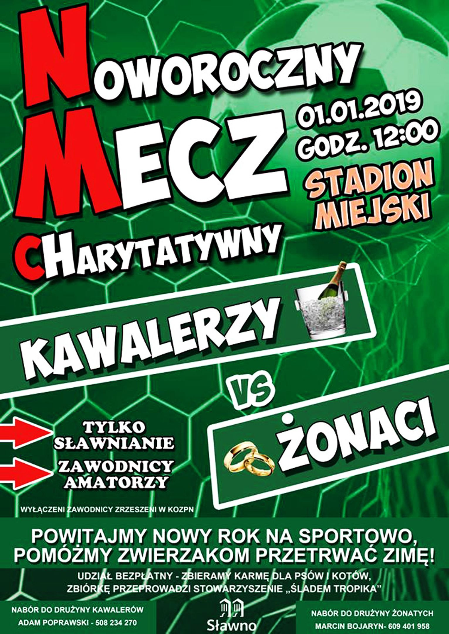W nietypowy sposób Nowy Rok powitają sławnianie, biorąc udział w niecodziennym meczu piłkarskim, w którym zmierzą się kawalerzy i żonaci! Spotkanie rozpocznie się 1 stycznia 2019 roku o godz. 12:00 na stadionie miejskim w Sławnie. W meczu uczestniczyć może każda osoba zamieszkała na terenie miasta. Wyłączeni są tylko zawodnicy zrzeszeni w KOZPN. Zachęcamy do uczestnictwa –- udział w meczu jest bezpłatny, jednak aby pomóc bezdomnym psom i kotom zorganizowana zostanie zbiórka karmy dla zwierząt, którą przeprowadzi Stowarzyszenie „Śladem Tropika”.
