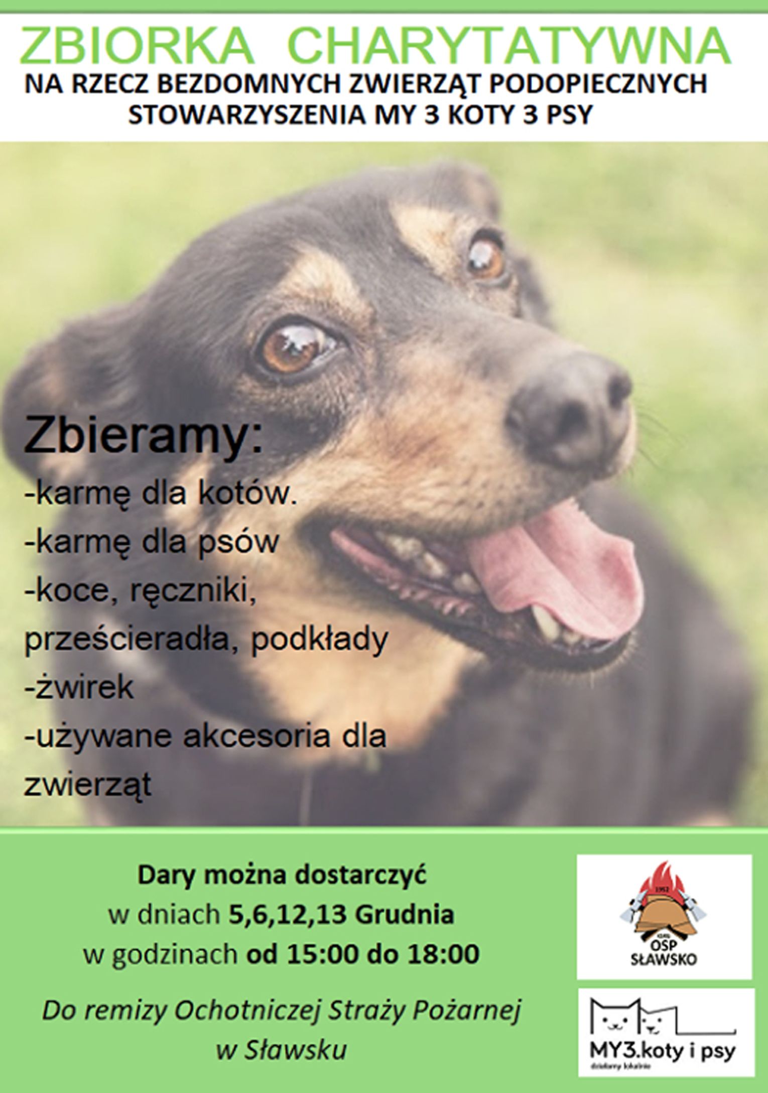 OSP Sławsko organizuje zbiórkę karmy dla zwierząt, będących pod opieką Stowarzyszenia My 3 koty i psy.