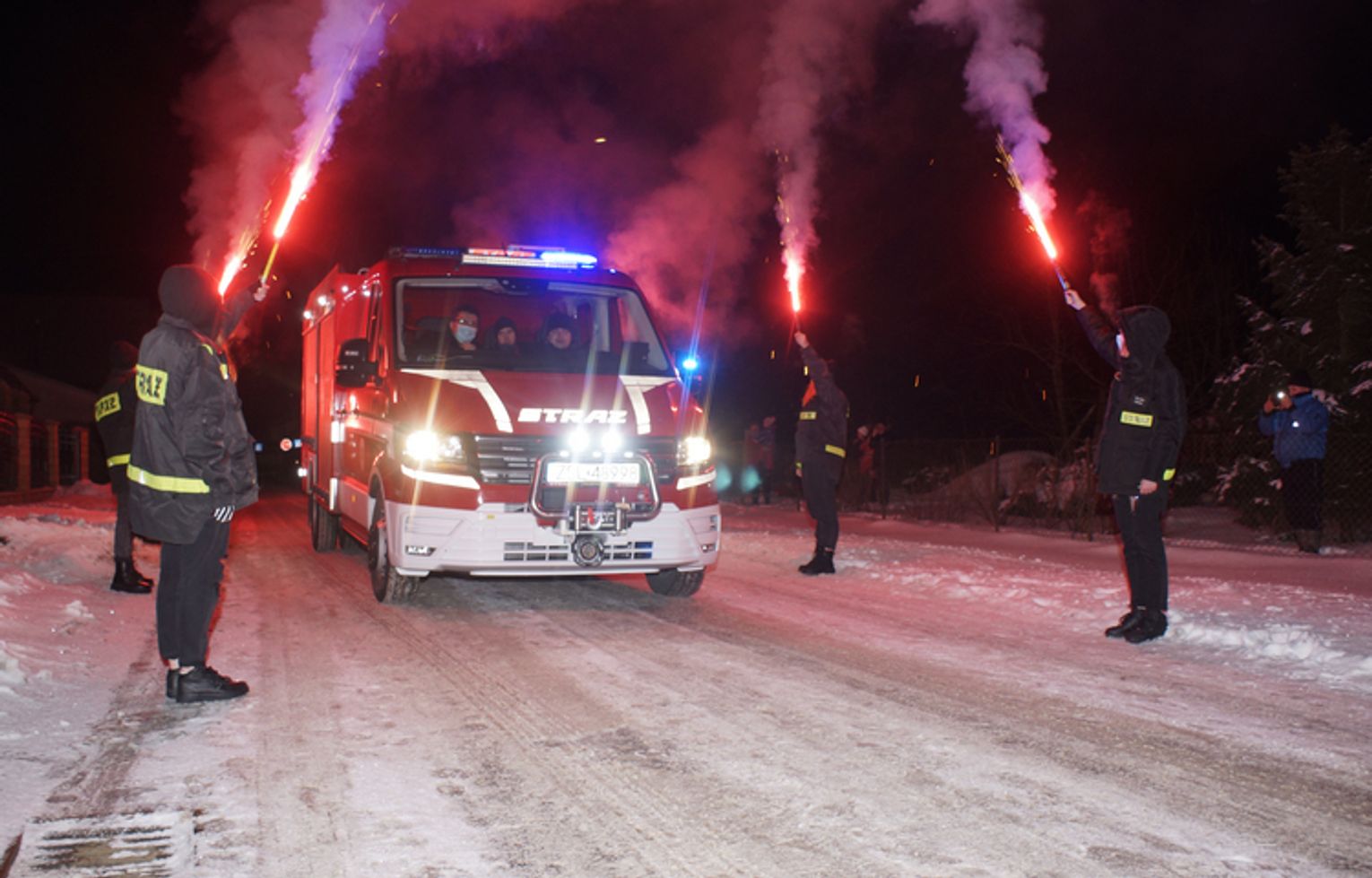Wyciem syren, fajerwerkami i szpalerem strażaków z pochodniami, w Słowinie powitano nowy lekki wóz bojowy miejscowej Ochotniczej Straży Pożarnej.