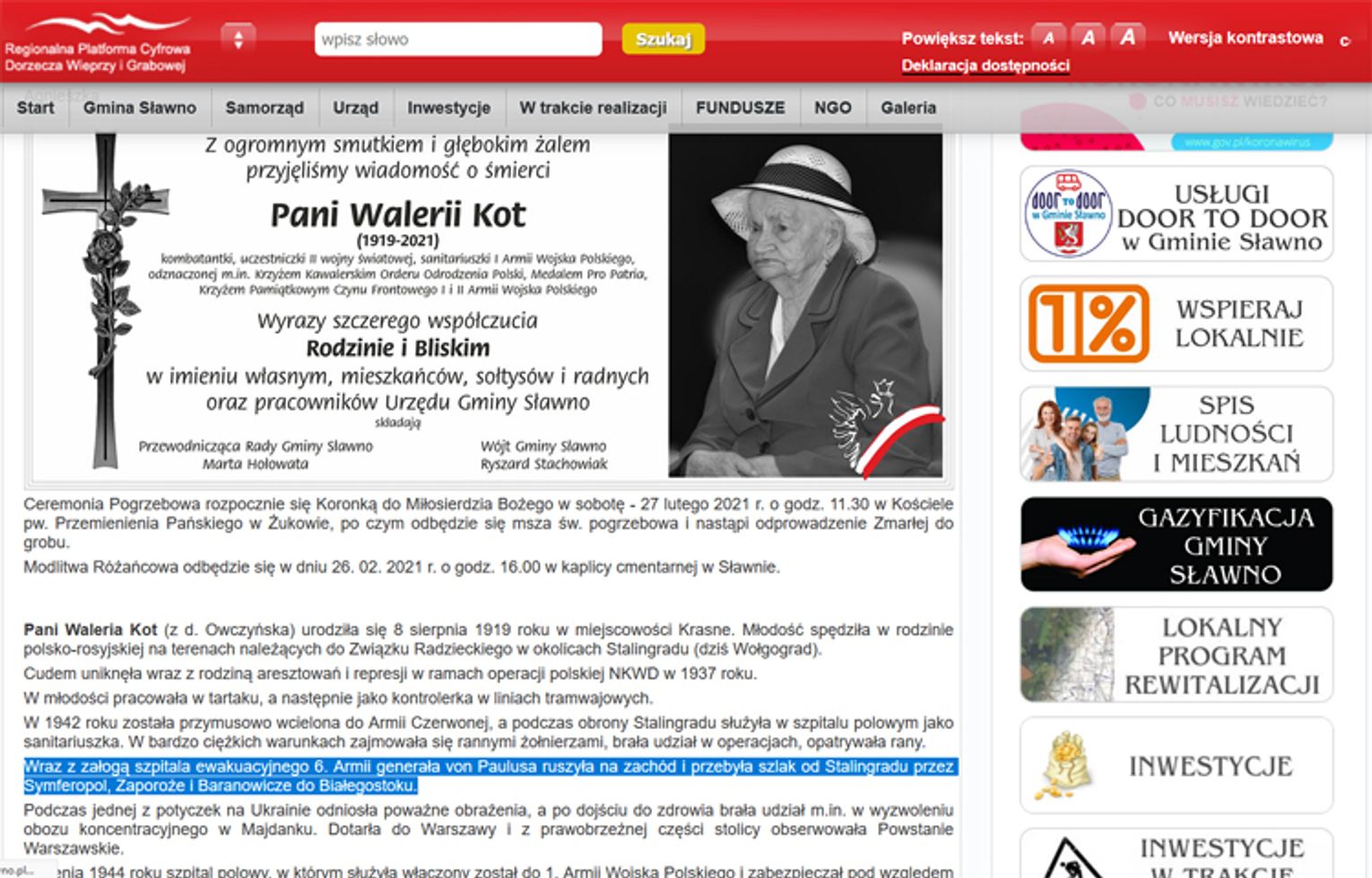Od kilku dni strona internetowa gminy Sławno informuje, że niedawno zmarła Waleria Kot służyła w... szpitalu 6 Armii gen. Paulusa i wraz z tą jednostką przebyła szlak bojowy od Stalingradu do Białegostoku.