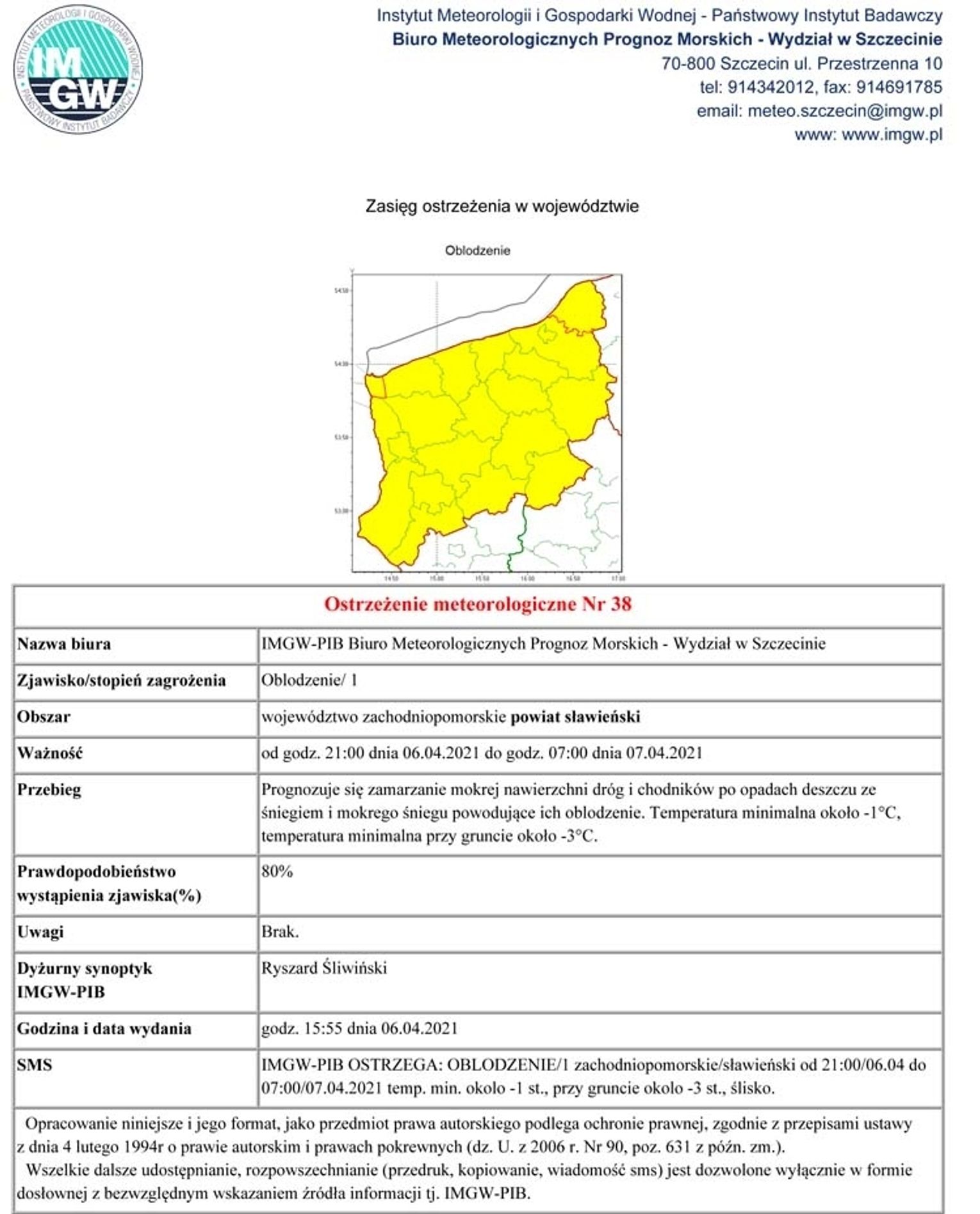 Prognozuje się zamarzanie mokrej nawierzchni dróg i chodników po opadach deszczu ze śniegiem i mokrego śniegu powodujące ich oblodzenie. Temperatura minimalna około -1°C, temperatura minimalna przy gruncie około -3°C.
