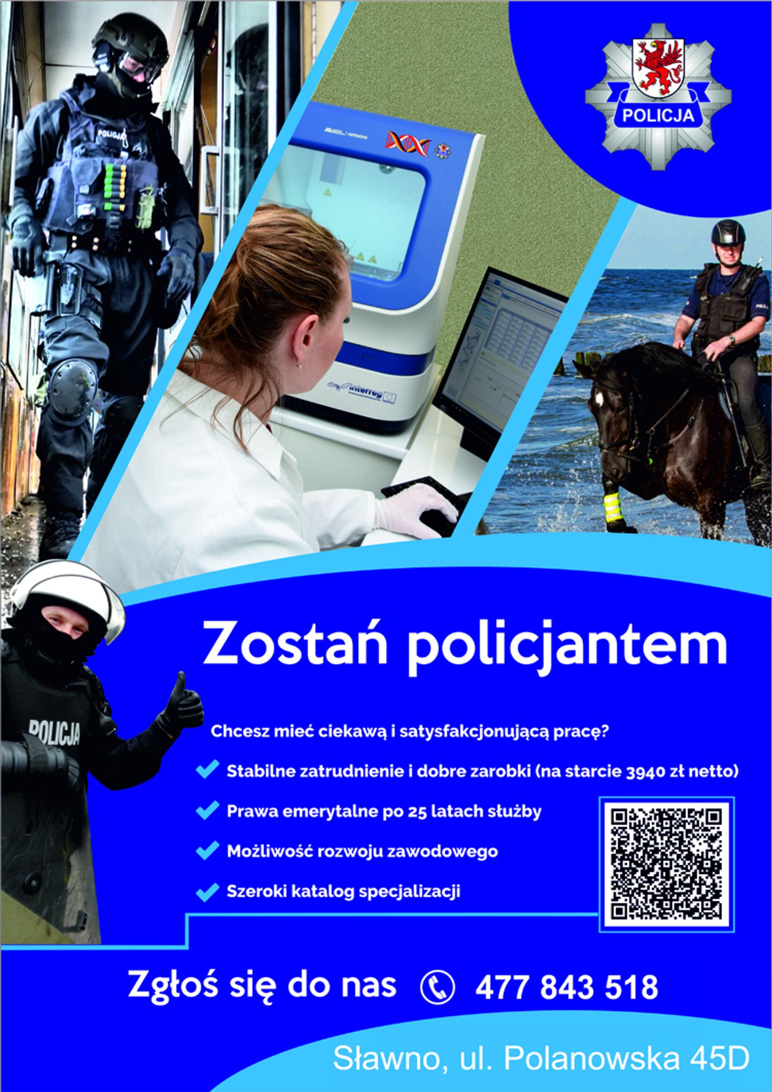 Sławieńscy funkcjonariusze zapraszają wszystkie osoby, które swoja przyszłość chcą związać ze służbą w Policji do Komendy powiatowej Policji w Sławnie. Podczas dni otwartych pracownicy Zespołu Kadr i Szkolenia będą udzielać szczegółowych informacji wszystkim zainteresowanym wstąpieniem w nasze szeregi.