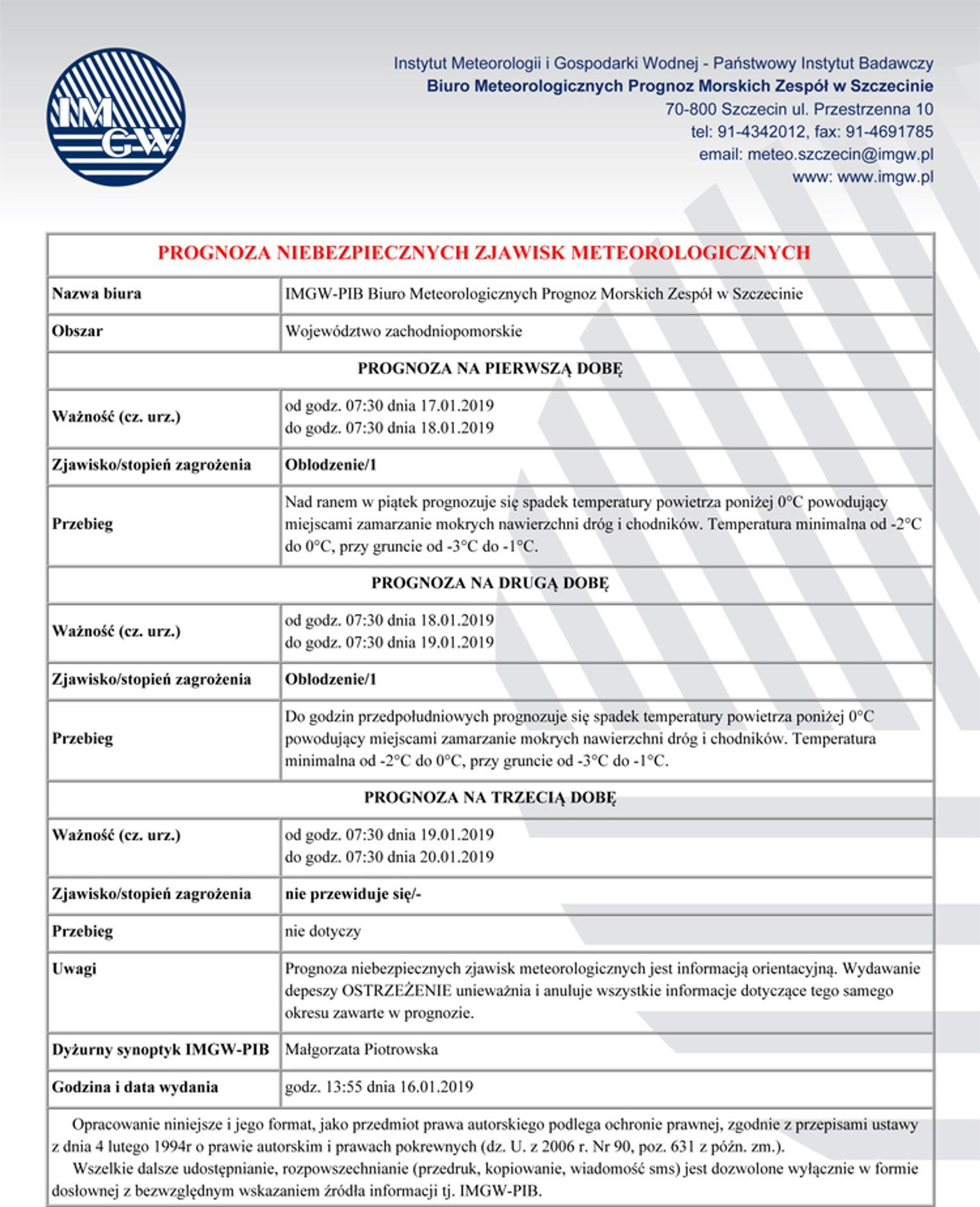 Od czwartku do soboty prognozuje się spadek temperatury poniżej 0ºC powodując zamarzanie mokrych nawierzchni dróg i chodników.
