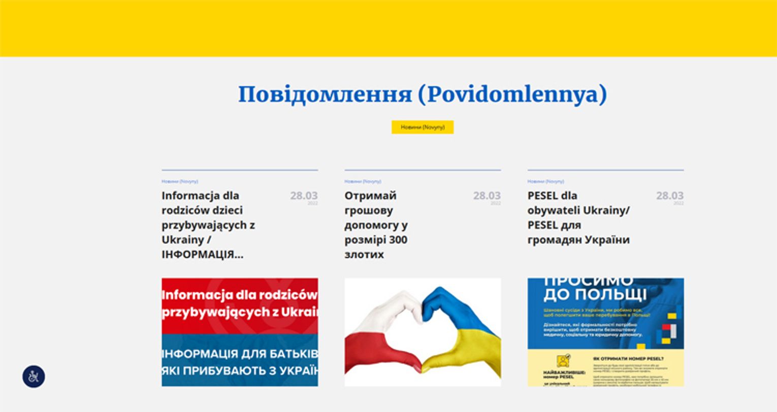 Strona internetowa z informacjami dla uchodźców. Na stronie dostępne są informacje m.in. dot. nadania numeru PESEL, świadczeń 500+ oraz jednorazowego świadczenia w wysokości 300 zł.