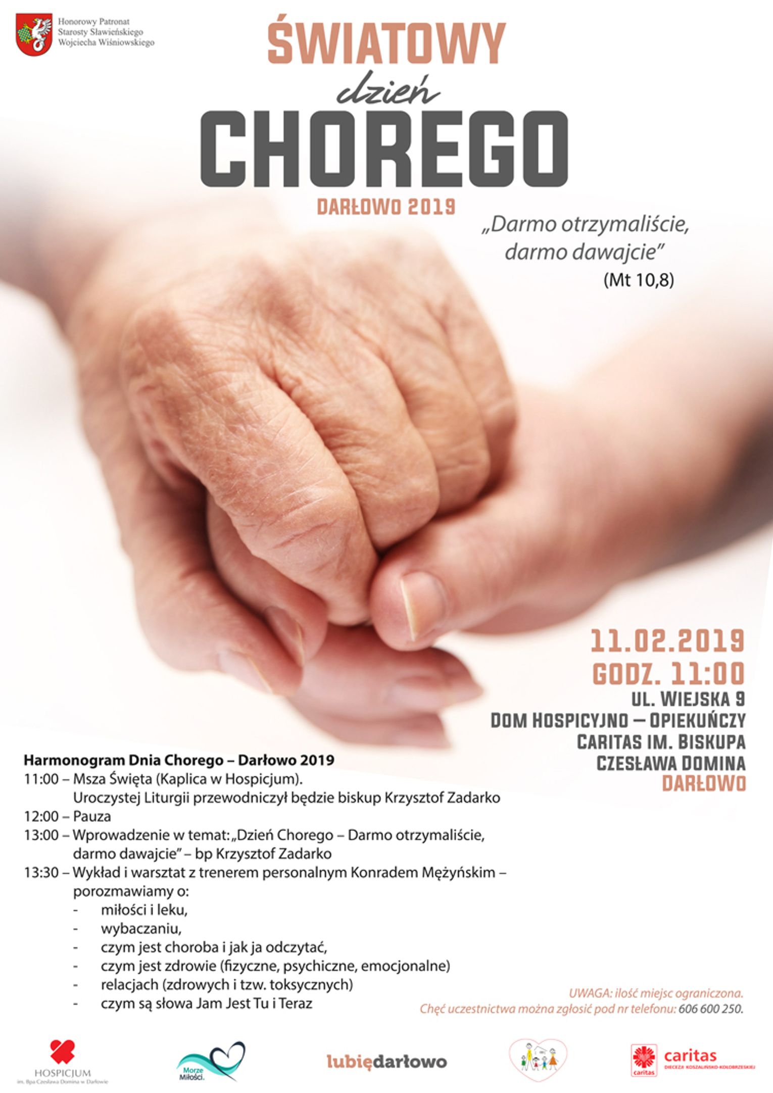 "Darmo otrzymaliście, darmo dawajcie" - to hasło tegorocznego Dnia Chorego, na który serdecznie zapraszamy do Darłowskiego Hospicjum w poniedziałek (11 lutego) o godz. 11:00.