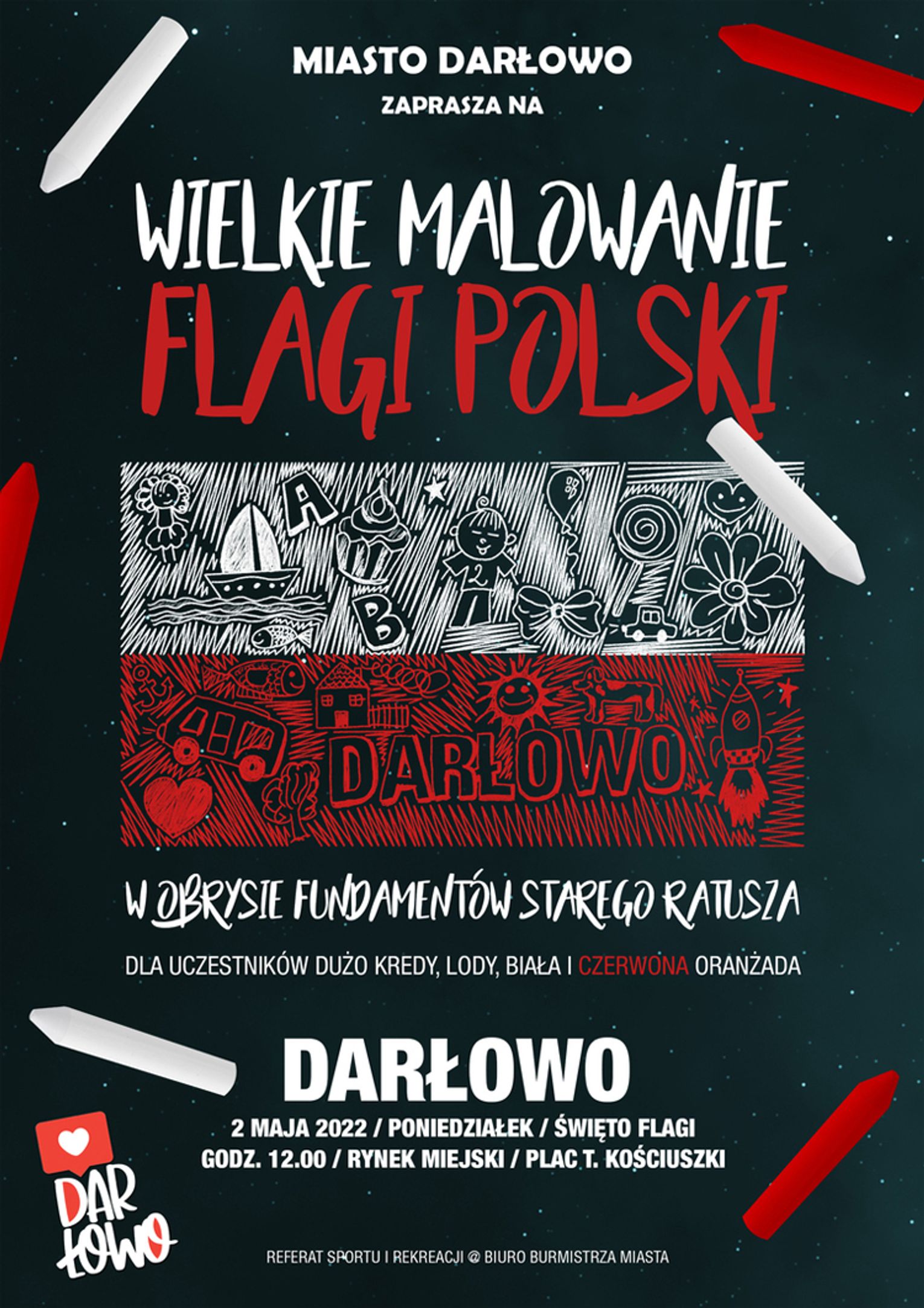 W zamyśle organizatorów jest namalowanie kredą największej flagi Polski. Do wyboru są tylko dwa kolory kredy i jej nie zabraknie dla nikogo. We wskazanym miejscu przez organizatorów możecie malować wybranym kolorem kredy co tylko sobie wymyślicie (domek, kwiatki, ptaszki czy też motylki). Wszystkie te arcydzieła stworzą piękny obraz naszej Flagi.