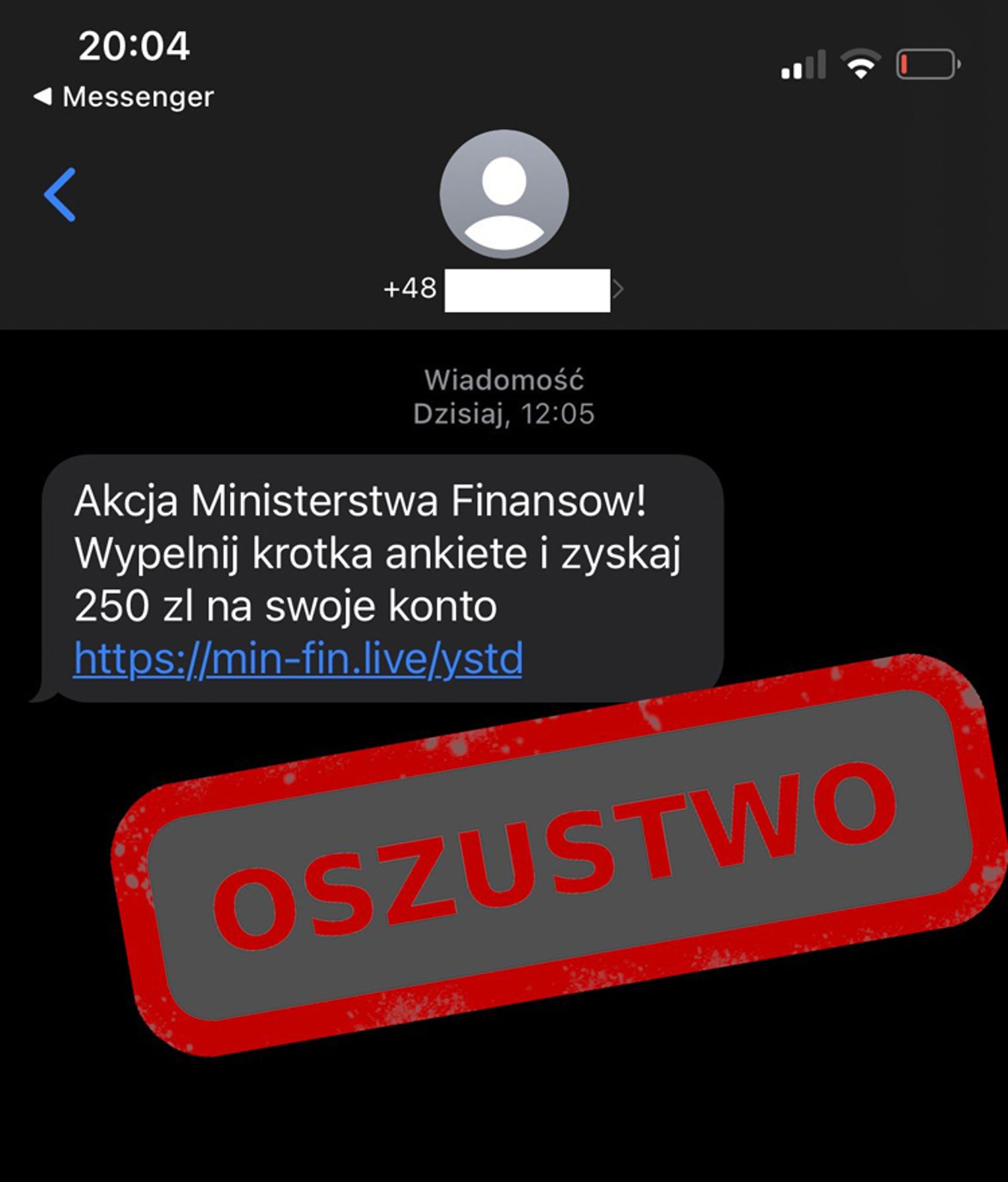 Link z SMS-a prowadzi do rzekomej ankiety MF, za której wypełnienie można otrzymać 250zł. Aby odebrać nagrodę, oszuści proszą o wpisanie danych użytkownika na fałszywym panelu logowania do banku.