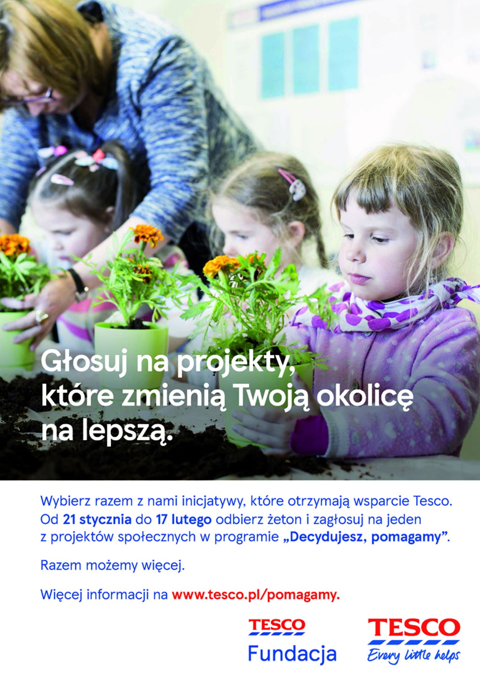 Tesco wraz z Fundacją Tesco od 2016 roku realizuje program społeczny „Decydujesz, pomagamy” i tym samym wspiera mieszkańców naszego kraju w realizowaniu ich pomysłów na lokalne inicjatywy. Projekty dotyczyły ważnych dla klientów aspektów: edukacji, promocji zdrowego stylu życia, rewitalizacji przestrzeni miejskich, aktywizacji osób starszych i wielu innych. Listę wszystkich projektów, na które można głosować w V edycji programu „Decydujesz, pomagamy” oraz dotychczasowo zrealizowane projekty można znaleźć na stronie www.tesco.pl/pomagamy.
