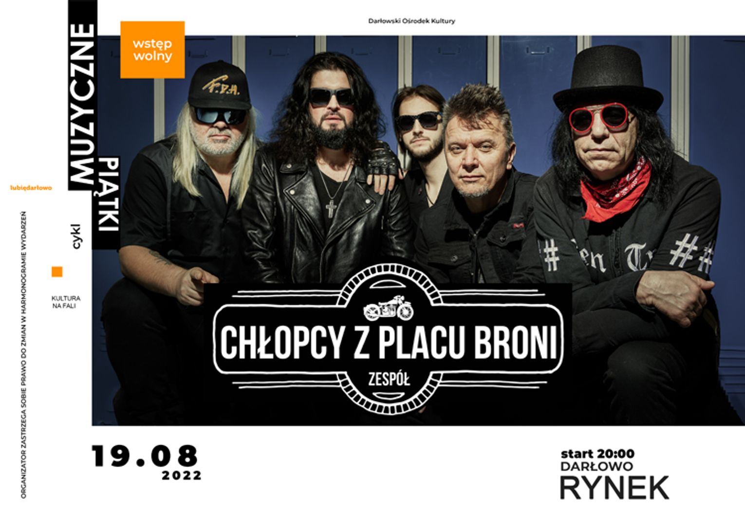 KONCERT - 19 sierpnia 2022, Start godz. 20:00, Wstęp wolny, Darłowo – Rynek Miejski. Zespół CHŁOPCY Z PLACU BRONI reaktywował się w 15. rocznicę śmierci lidera zespołu Bogdana Łyszkiewicza. Powracamy z inicjatywy dobrego serca i pozytywnych wibracji jakie niosą utwory nieżyjącego lidera grupy. Chcąc jak najdłużej zatrzymać w pamięci te wspaniałe piosenki o miłości, pokoju, wolności i przyjaźni postanowiliśmy wraz z grupą przyjaciół reaktywować zespół wykonując jego największe przeboje: O Ela, Kocham Cię, Aeroplan, Kocham Wolność i wiele innych piosenek.