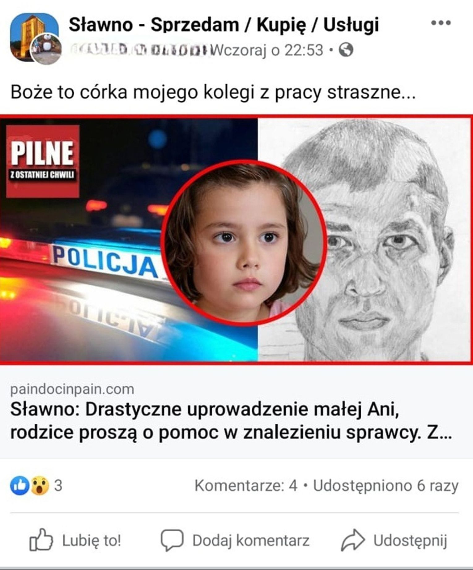 W tym tygodniu w lokalnych serwisach ogłoszeniowych pojawiła się kolejna informacja o rzekomym zaginięciu dziecka. Miało chodzić o „drastyczne uprowadzenie małej Ani”, której załamani rodzice proszą o pomoc w znalezieniu sprawcy. Nie otrzymaliśmy żadnego zgłoszenia w tej sprawie.