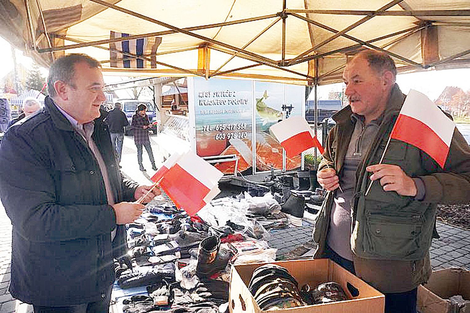 We wtorek mieszkańcom Sławna, wraz z grupa współpracowników, rozdawał małe biało-czerwone flagi.