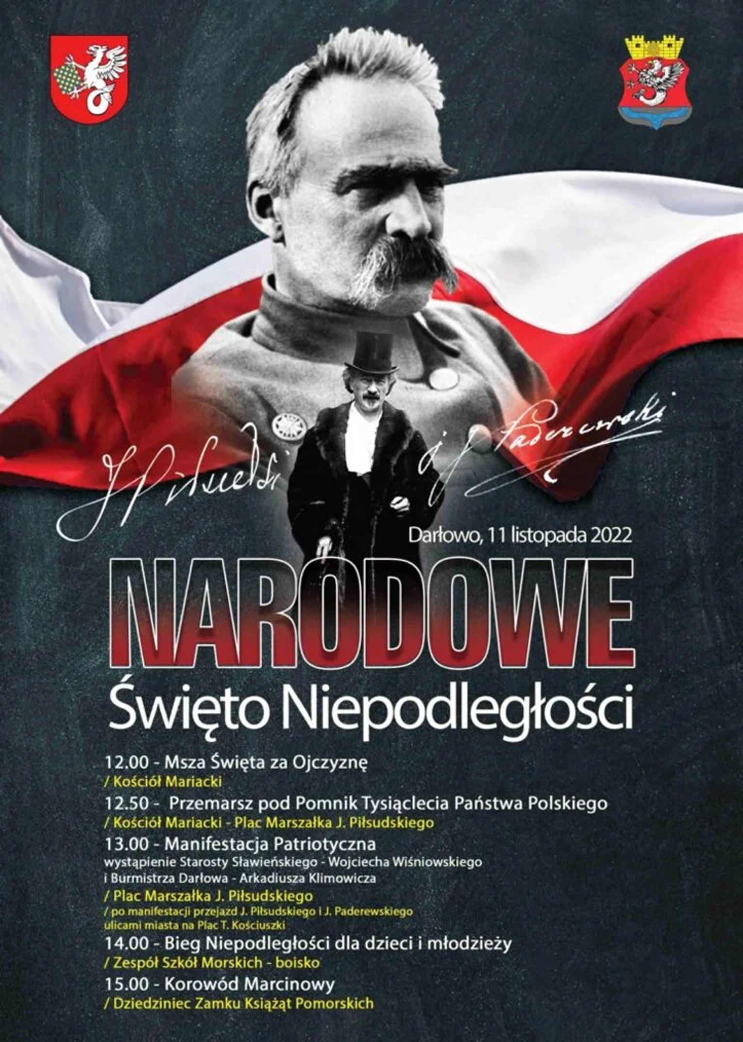 Starosta Sławieński – Wojciech Wiśniowski oraz Burmistrz Darłowa – Arkadiusz Klimowicz wygłoszą podniosłe przemówienia. Nie zabraknie też salwy i symbolicznego złożenia kwiatów u podnóży obelisku przez przedstawicieli powiatu, darłowskiego samorządu, instytucji, organizacji, szkół i klubów. Manifestację Patriotyczną zwieńczy symboliczny pokaz sztucznych ogni i flar dymnych w barwach narodowych. Po tym akcencie Józef Piłsudski i Jan Paderewski udadzą się w galowy przejazd ulicami miasta, gdzie odwiedzą m.in. zaplanowane w tym dniu Biegi Niepodległości dla dzieci i młodzieży w Zespole Szkół Morskich, a także zatrzymają się na Placu Tadeusza Kościuszki, gdzie w panoramie miejskiego rynku spacerowicze będą mogli uwiecznić się z nimi na wspólnej fotografii.