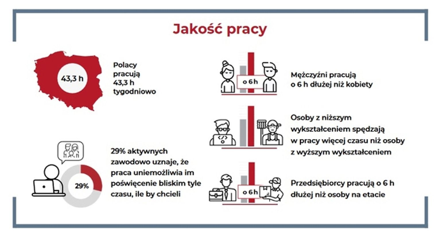 Średnio 43,3 godzin tygodniowo poświęcamy pracy. Osoby z wykształceniem niższym pracują najwięcej, bo aż 46 godzin, przy czym mężczyźni spędzali w pracy o 6 godzin dłużej niż kobiety. Wyższe wykształcenie wiązało się z krótszą pracą (ok. 42h względem ok. 44h).