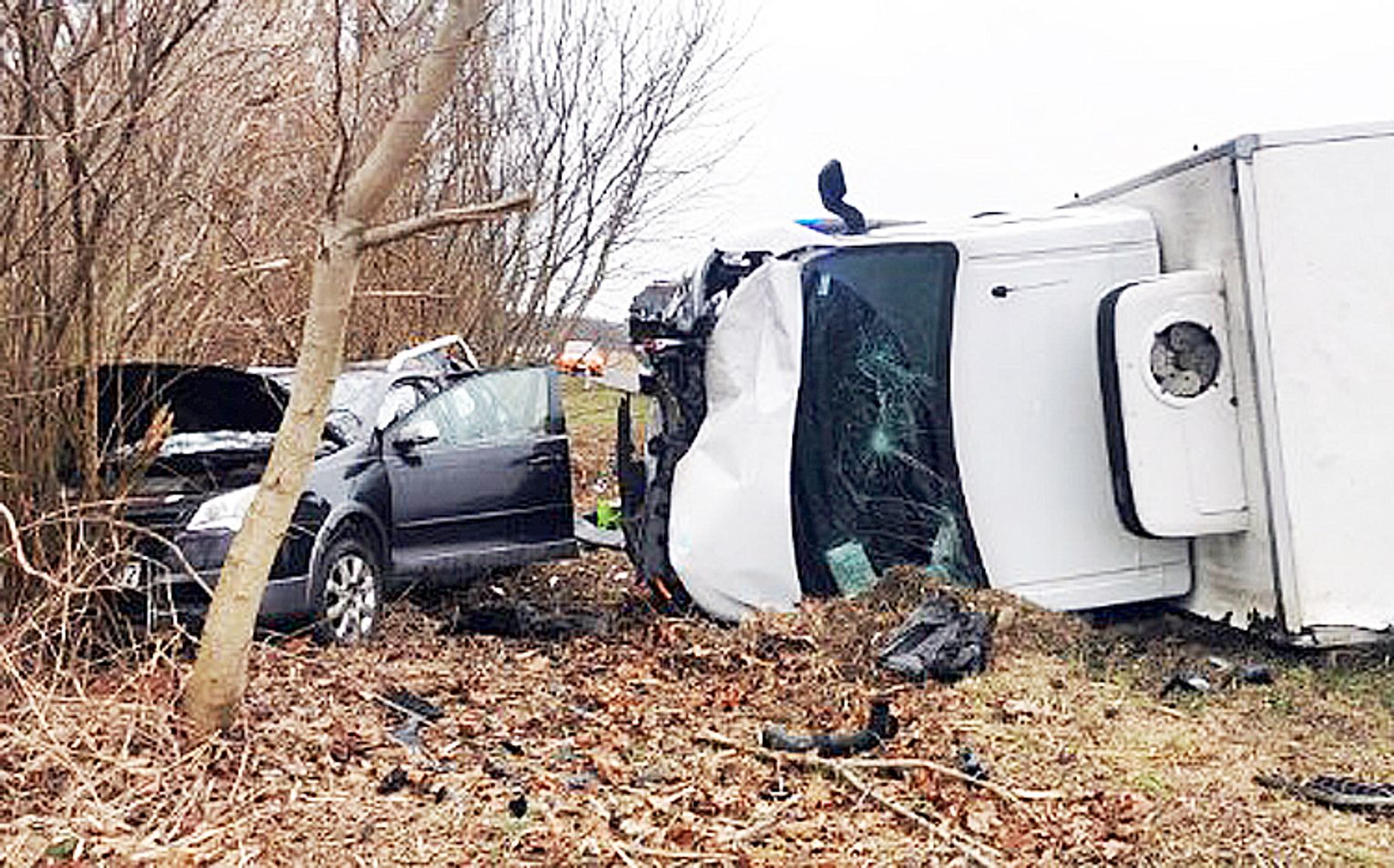 Volkswagen Polo zderzył się z dostawczym Renaultem. Ciężkich obrażeń doznały dwie osoby podróżujące Volkswagenem. Pasażerka pojazdu - 65 – letnia kobieta na pewien czas utraciła funkcje życiowe. Najpierw reanimowali ją strażacy, potem ratownicy ZRM. Z powodzeniem. Została odwieziona do szpitala w Koszalinie. Podobnie jak 70 – letni kierowca, który doznał poważnej kontuzji kręgosłupa. Kierowcy Renault nic się nie stało.