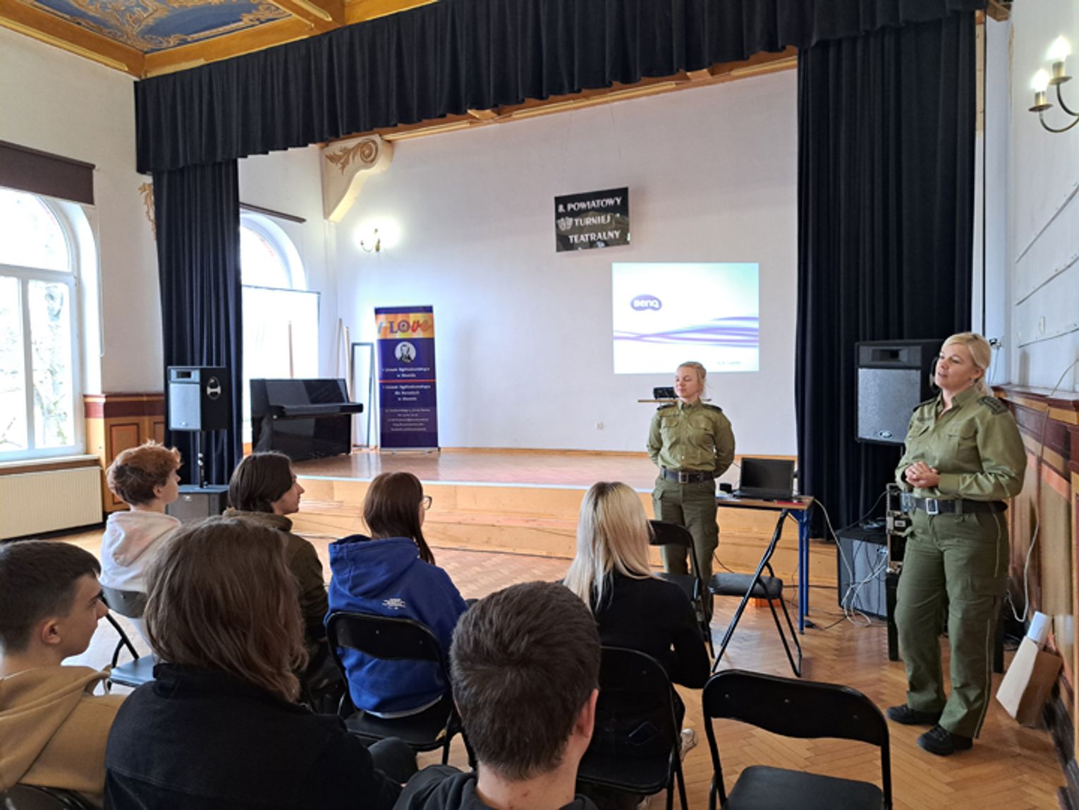 Podczas spotkania funkcjonariuszki Pani Sylwia Biłyk oraz Daria Walkowiak przybliżyły zadania Straży Granicznej i szczegółowo omówili zasady prowadzonego aktualnie naboru do służby w Morskim Oddziale Straży Granicznej.