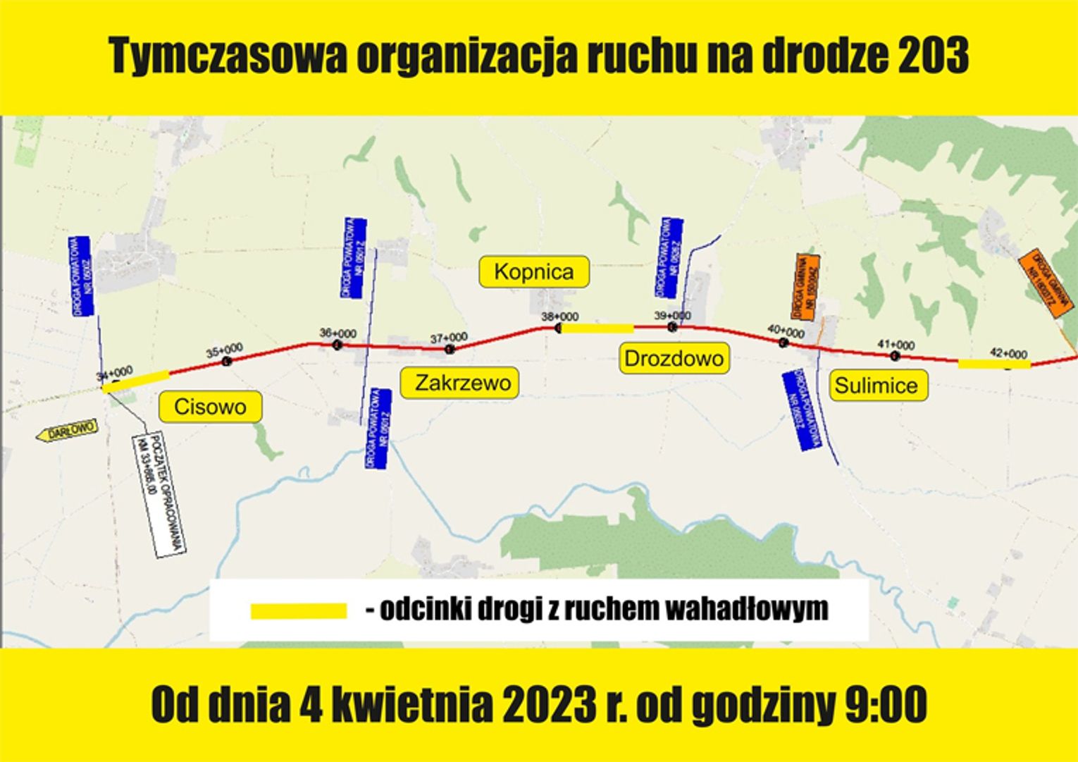 W związku z rozbudową drogi wojewódzkiej 203 wykonawca zawiadamia o wprowadzeniu tymczasowej organizacji ruchu od dnia 4 kwietnia 2023 od godziny 9:00.