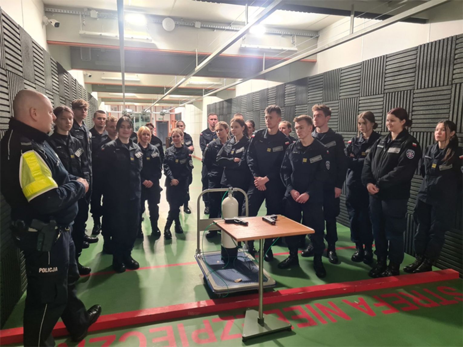 Na koniec spotkania uczniowie zwiedzili strzelnicę. Policjant od spraw wyszkolenia strzeleckiego omówił przepisy obowiązujące na strzelnicy, zasady szkolenia w policji oraz zasady bezpieczeństwa panujące na obiektach komendy. Dzięki temu, że strzelnica wyposażona jest w nowoczesny system multimedialny Milo Range, umożliwiający interaktywne strzelanie z możliwością zmiany scenariusza „akcji”, uczniowie mieli możliwość wykonywania strzelań statycznych z broni szkoleniowej.