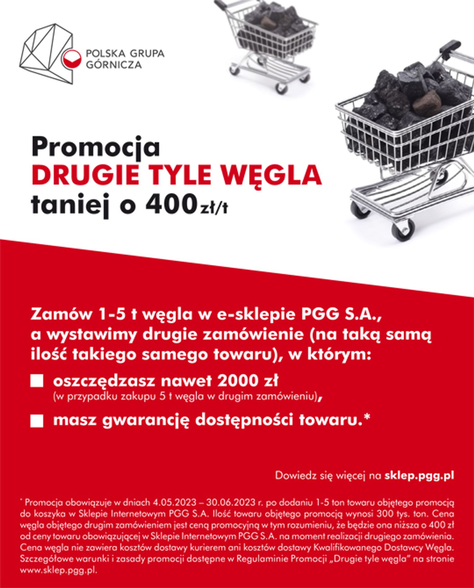 Szczegółowe warunki i zasady promocji dostępne są w Regulaminie Promocji „Drugie tyle węgla” na stronie sklep.pgg.pl.