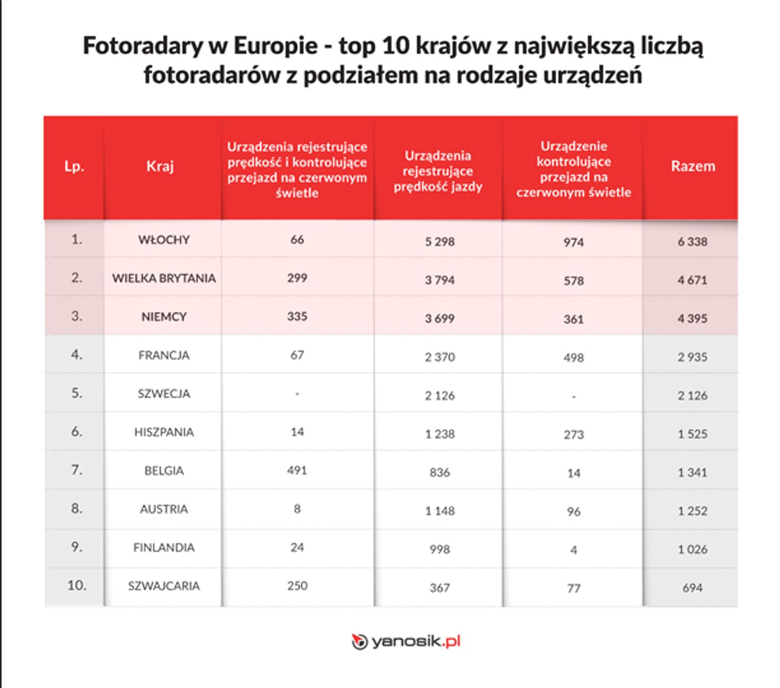 - Nasze zestawienie podzieliliśmy na trzy kategorie urządzeń: rejestrujące prędkość jazdy, kontrolujące przejazdy na czerwonym świetle oraz takie, które jednocześnie mierzą prędkość i rejestrują przejazdy na czerwonym świetle. Spośród europejskich krajów najwięcej fotoradarów, które kontrolują wyłącznie prędkość jazdy, znajduje się we Włoszech – 5 298 urządzeń. W tym kraju jest również najwięcej tych urządzeń, które rejestrują wyłącznie przejazd na czerwonym świetle – 974 fotoradary – informuje Małgorzata Dąbrowska, Yanosik.