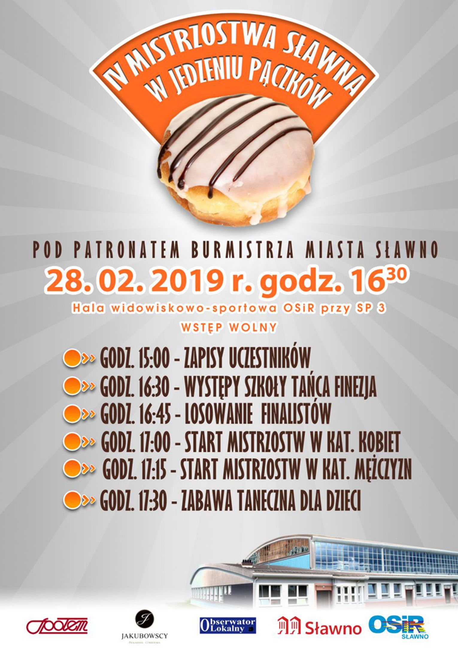 Organizatorzy - Urząd Miejski w Sławnie, Ośrodek Sportu i Rekreacji w Sławnie, Piekarnia Wyrób i Sprzedaż Jakubowscy ze Sławna, „Społem” Powszechna Spółdzielnia Spożywców w Sławnie oraz Obserwator Lokalny ze Sławna zapraszają na konkurs w jedzeniu pączków.