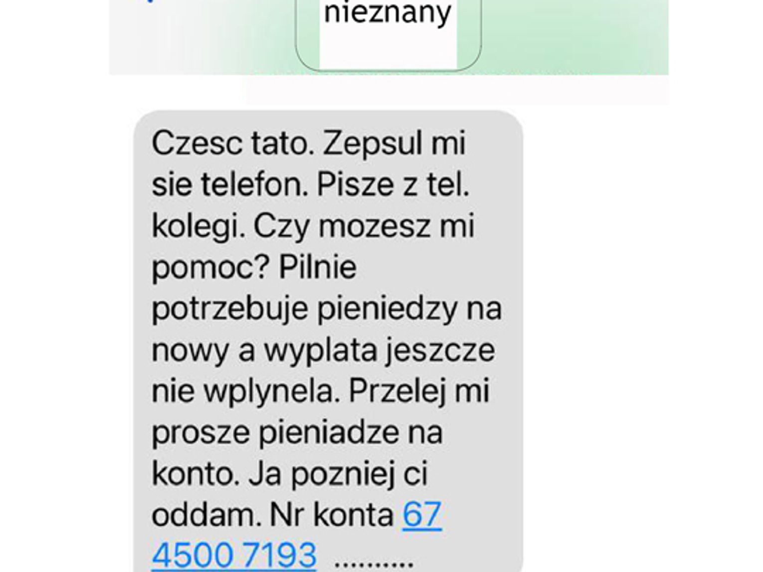 W ostatnim czasie sprawcy wysyłają wiadomości SMS, informując o uszkodzonym telefonie i prosi o skontaktowanie się przez komunikator. Podszywając się pod bliskich, którzy rzekomo potrzebują pieniądze na nowy telefon, oszuści dążą do sytuacji, w której sami przelejemy im pieniądze na wskazane konto, bądź przekażemy dane umożliwiające przejęcie rachunku bankowego. Najczęściej narzucają presję czasu, aby pokrzywdzone osoby nie miały chwili na weryfikację podanych informacji w wiadomościach tekstowych bądź telefonicznych.