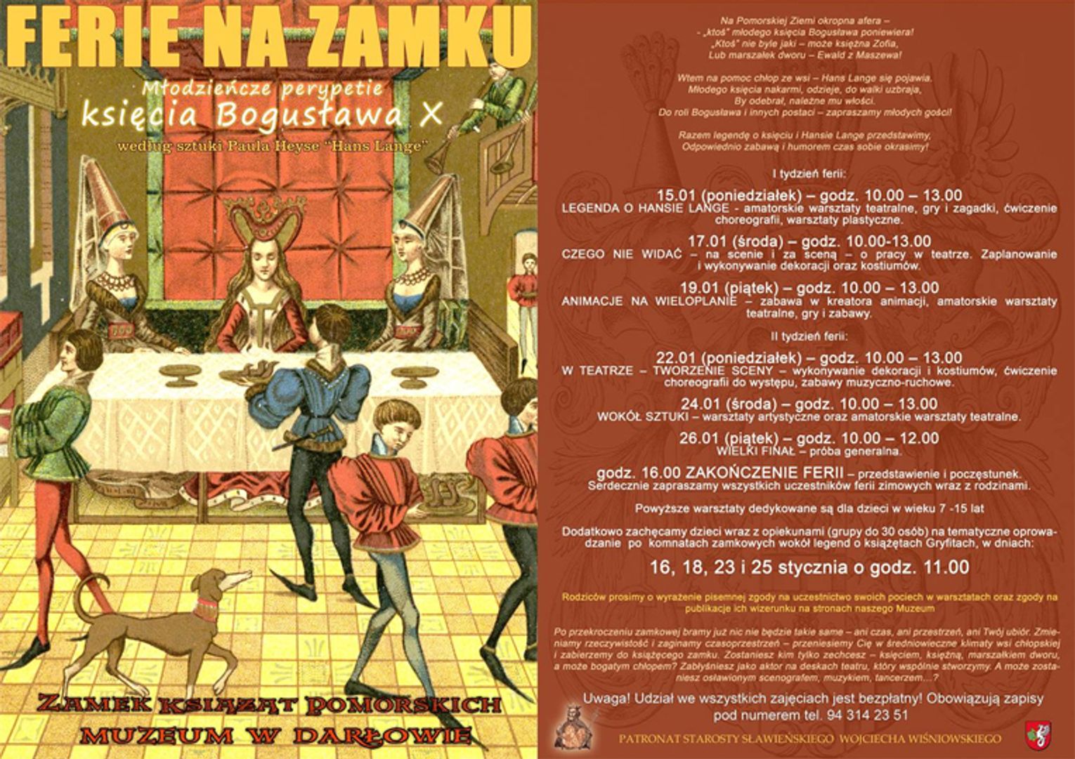 Serdecznie zapraszamy dzieci w wieku 7 – 15 lat do zapisów na BEZPŁATNE zajęcia oraz udziału w przedstawieniu podczas ferii zimowych 2024. Zapisy od poniedziałku do piątku w godzinach 8.00 – 15.00 pod nr tel. 94-314-23-51 – liczba miejsc ograniczona!