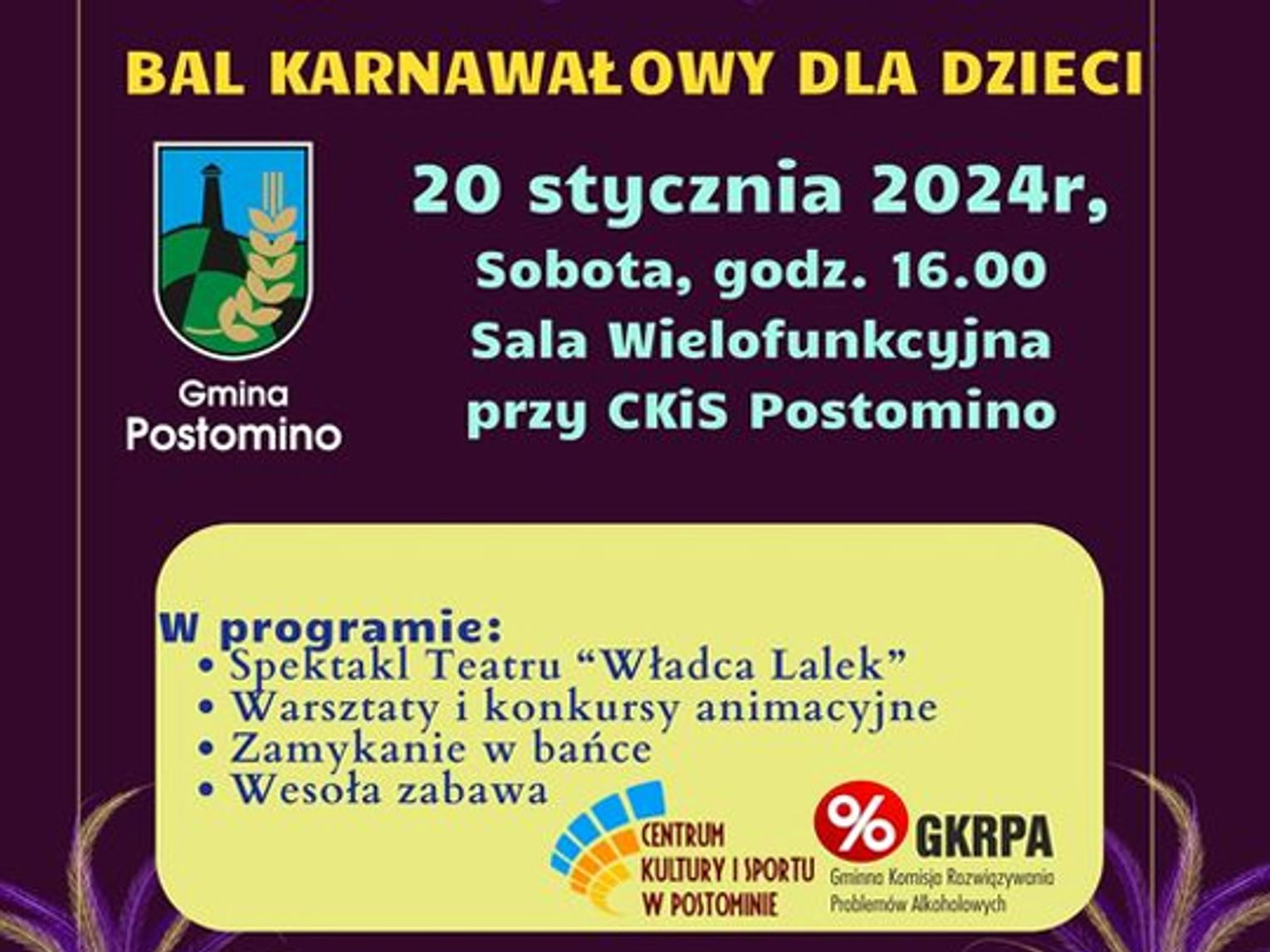 Bal odbędzie się w Sali Wielofunkcyjnej przy Centrum Kultury i Sportu w Postominie 20 stycznia o godz. 16:00