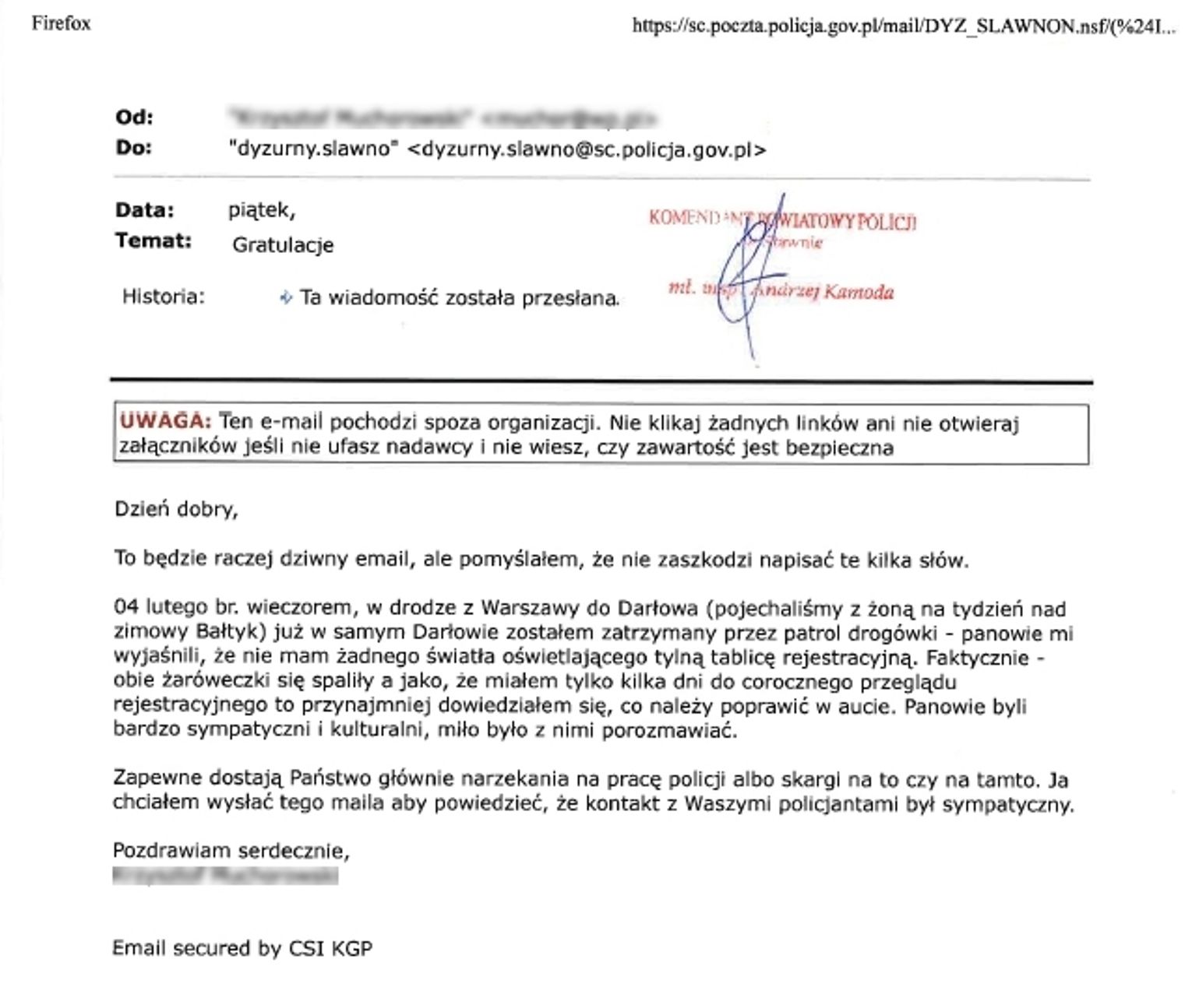 Policjanci czuwają nad bezpieczeństwem mieszkańców o każdej porze dnia i nocy. Starają się, aby przeprowadzane interwencje czy kontrole drogowe były na jak najwyższym poziomie. O tym przekonał się przejeżdżający przez powiat sławieński kierowca, który podróżował z Warszawy do Darłowa. Mężczyzna przesłał do Komendy Powiatowej Policji w Sławnie maila, w którymi podziękował za profesjonalne potraktowanie przez funkcjonariuszy Ogniwa Ruchu Drogowego sławieńskiej komendy podczas kontroli drogowej.