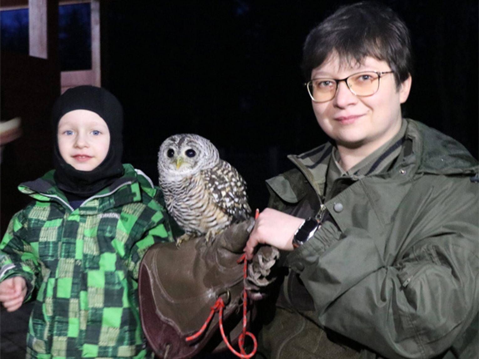 Wieczór rozpoczęliśmy od wykładu o sowach. Była to doskonała okazja, by zgłębić wiedzę na temat tych fascynujących nocnych ptaków, ich zwyczajów oraz roli w ekosystemie lasu. Uczestnicy mieli też niepowtarzalną szansę bliższego poznania sów, dzięki obecności sokolnika i jego podopiecznych. Obserwacja tych wyjątkowych ptaków z bliska była niezapomnianym przeżyciem zarówno dla dzieci jak i dorosłych.