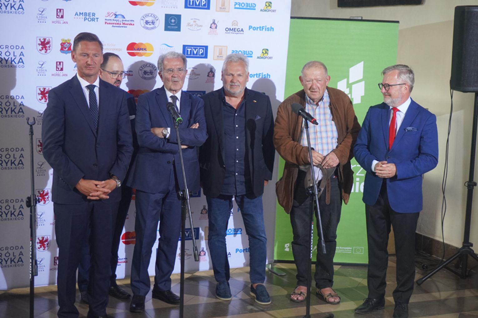 Przed jutrzejszą galą Nagrody Króla Eryka Pomorskiego, na darłowskim zamku zorganizowano konferencję prasową. Wzięli w niej udział: od lewej: Olgierd Geblewicz - marszałek Pomorze Zachodnie, Romano Prodi - były premier Republiki Włoskiej i Przewodniczący Komisji Europejskiej, Aleksander Kwaśniewski - były Prezydent RP, Adam Michnik - red. naczelny Gazeta Wyborcza, Arkadiusz Klimowicz - burmistrz Miasto Darłowo.