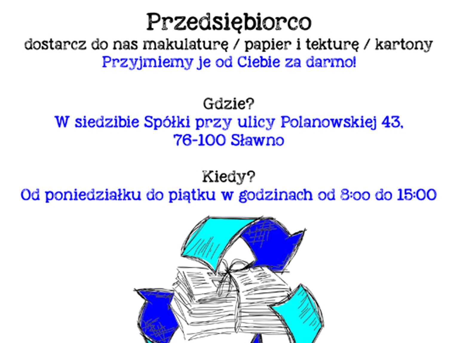 Makulaturę będzie można zdać za darmo do 30 września br. Należy ją dostarczyć do siedziby spółki przy ul. Polanowskiej 43, od poniedziałku do piątku w godzinach 8:00 15:00