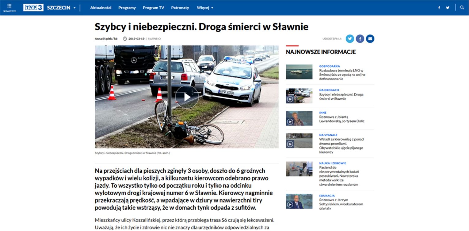 Nie tylko my interesujemy się problemem niebezpiecznego odcinka na ulicy Koszalińskiej w Sławnie, na którym kilkakrotnie doszło do wypadków śmiertelnych - o drogowej sytuacji wspominają w regionalnej telewizji. Reportaż pojawił się również w programie Teleexpress. Zapraszamy do Kroniki Szczecina: https://szczecin.tvp.pl/41808564/szybcy-i-niebezpieczni-droga-smierci-w-slawnie. Ponadto więcej informacji o zagrożeniach na drodze krajowej nr 6 w jutrzejszym wydaniu Obserwatora Lokalnego.