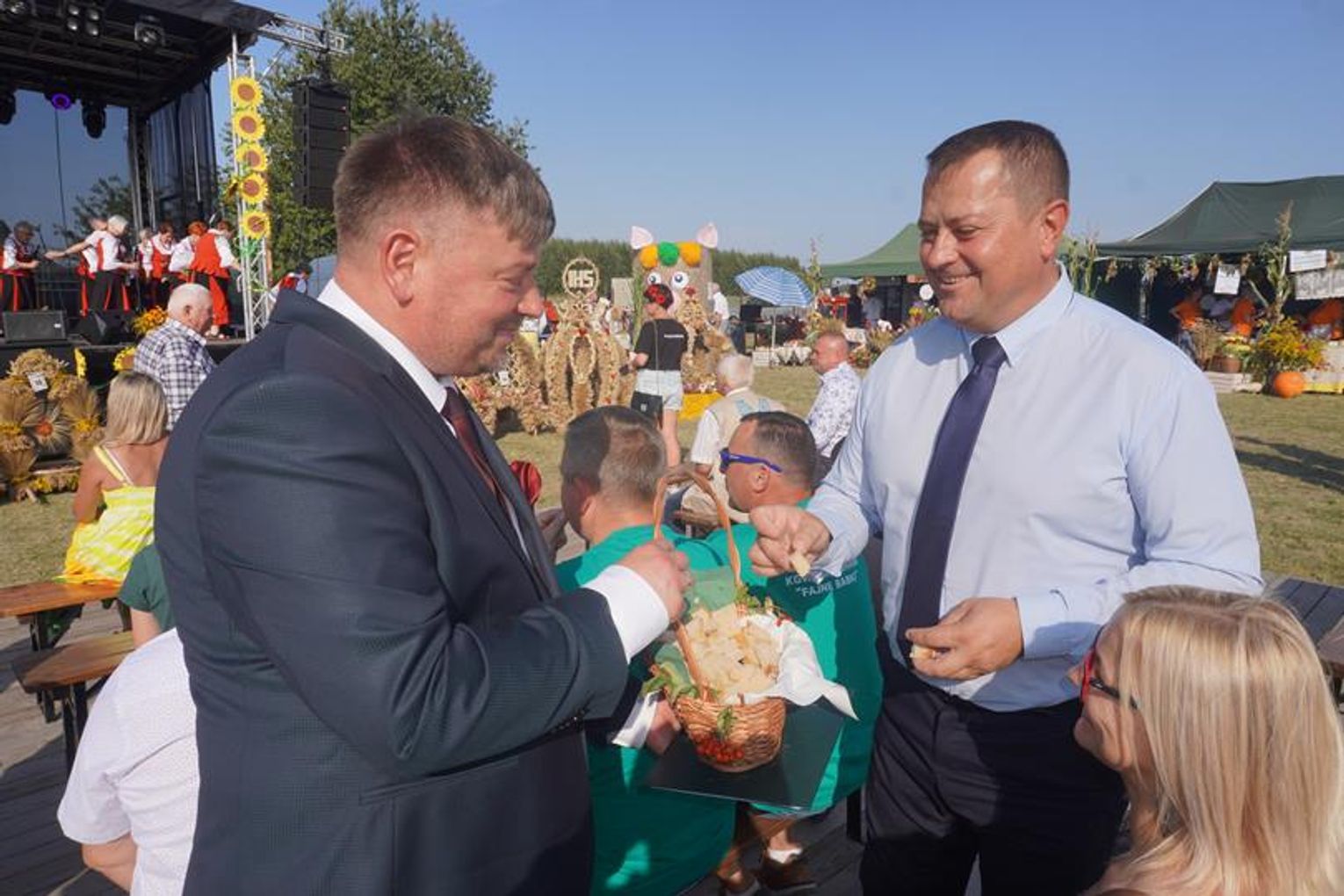 Na miejscu Krzysztof Jarotek, wójt gm. Malechowo i Magdalena Jadczak, przewodnicząca Rady Gminy Malechowo, pomiędzy sołtysów, podzielili chleb wypieczony z tegorocznego zboża. Potem sami częstowali nim uczestników dożynek.